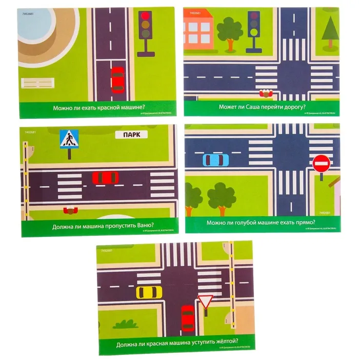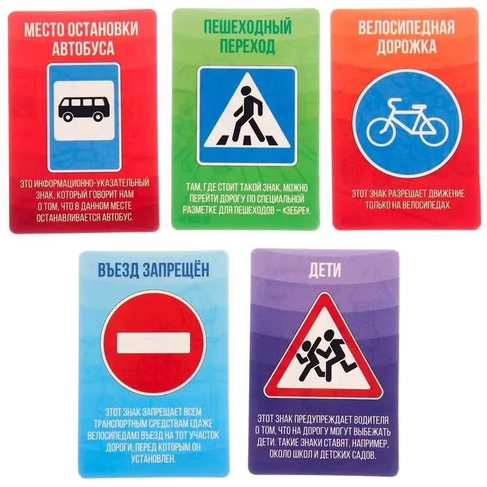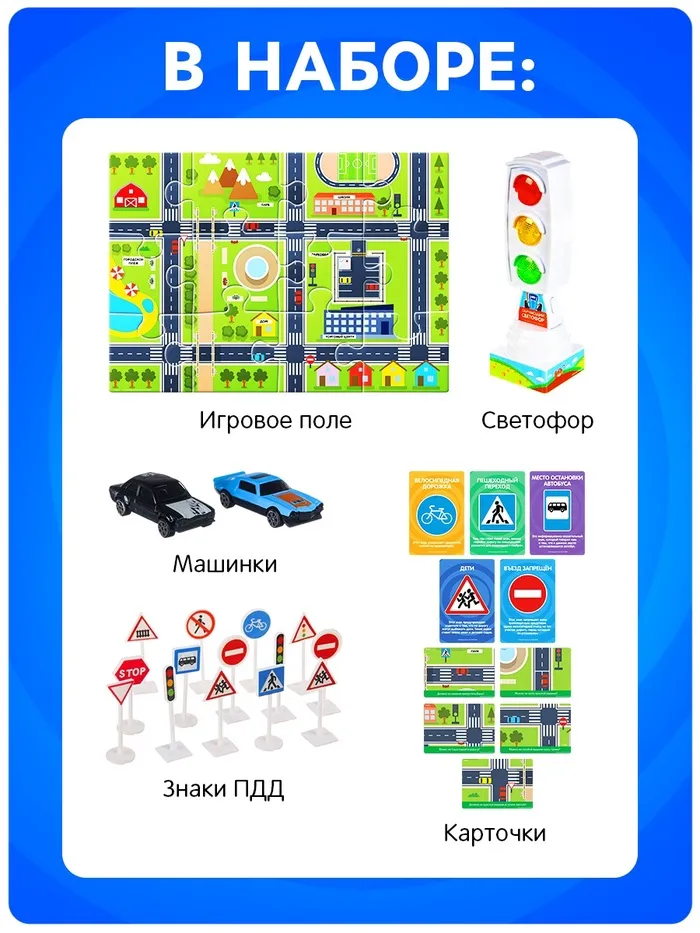 - Обучающие материалы в комплекте: в набор входят карточки с заданиями, которые помогают закрепить знания о правилах дорожного движения. Обучающие карточки и дорожные знаки делают процесс познавательным: ребёнок учится распознавать знаки и правильно реагировать на них.