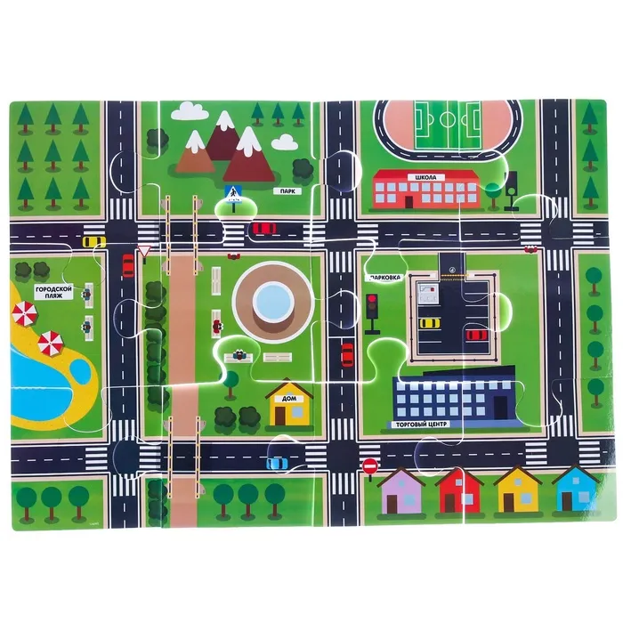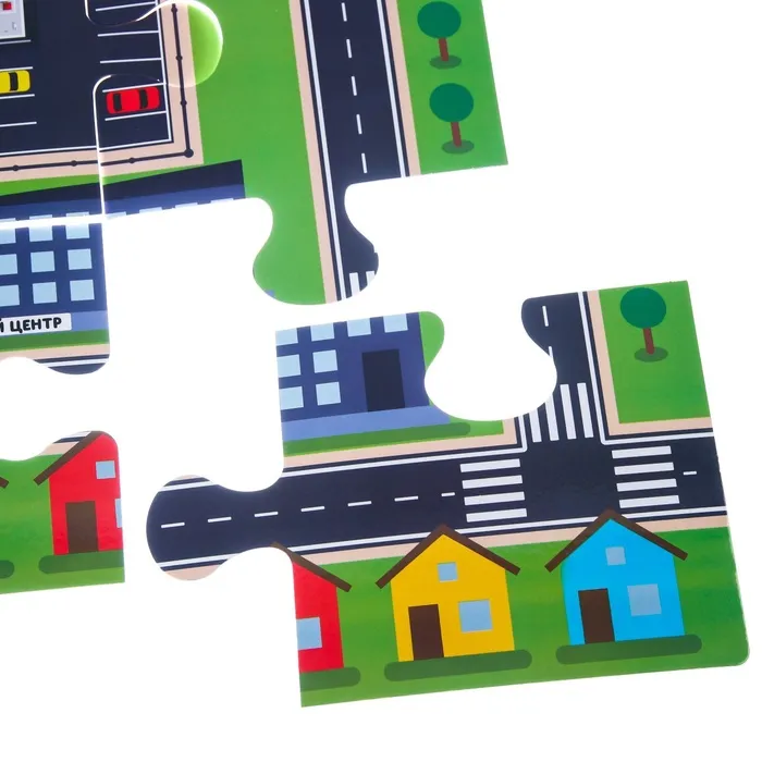 - Яркое игровое поле: поле-пазл собирается в настоящую картину города: дорога, дома, деревья и другие элементы. Оно создаёт атмосферу настоящего уличного движения, где можно разыгрывать сценарии с машинками и учиться ориентироваться в пространстве.