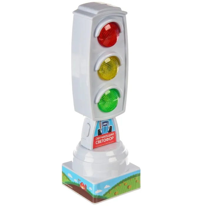 - Для детей: все элементы безопасны, крупные и без острых углов. Светофор работает от батареек (3 штуки LR44 уже включены в комплект), поэтому можно начать играть сразу после распаковки.