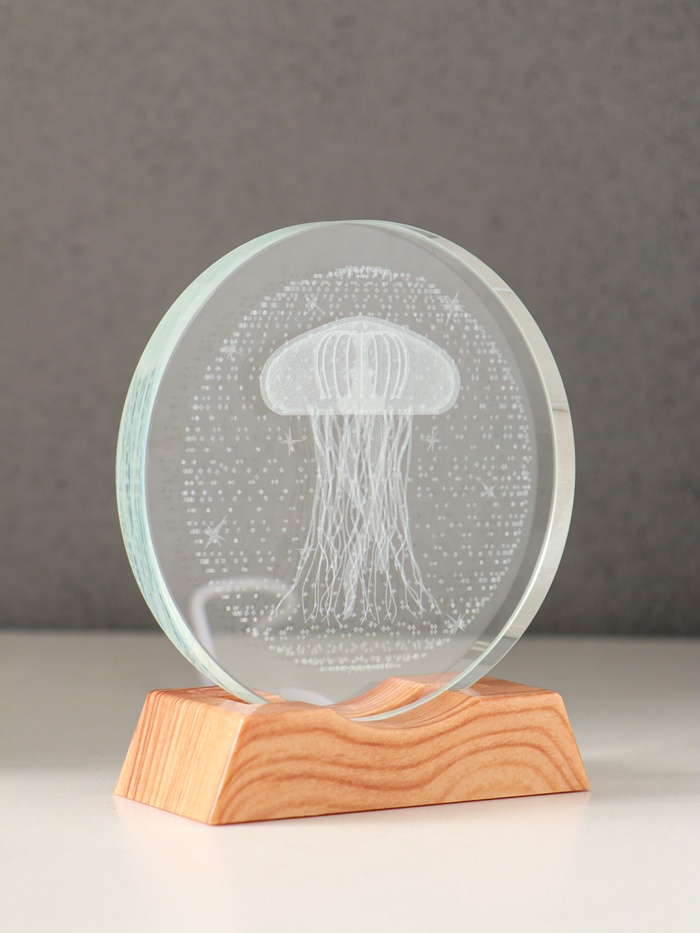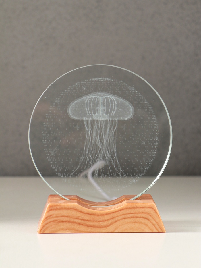 Эта голографическая медуза в стеклянном диске создаёт магию света и движения. Поместите её на стол или полку, и пространство наполнится успокаивающим, футуристичным сиянием. Это не просто светильник, а живое цифровое искусство, меняющее атмосферу комнаты.