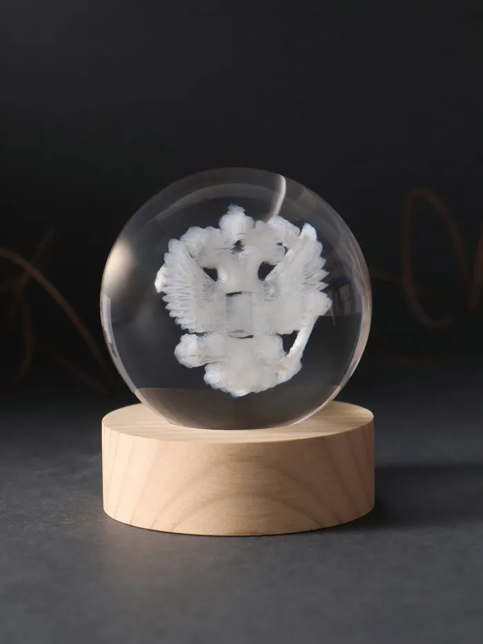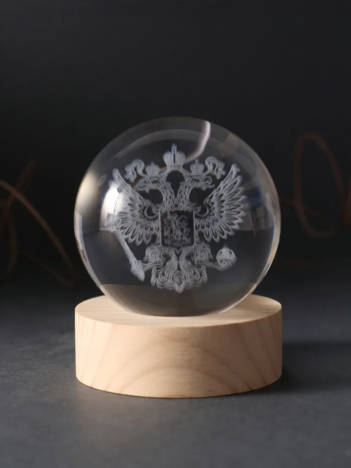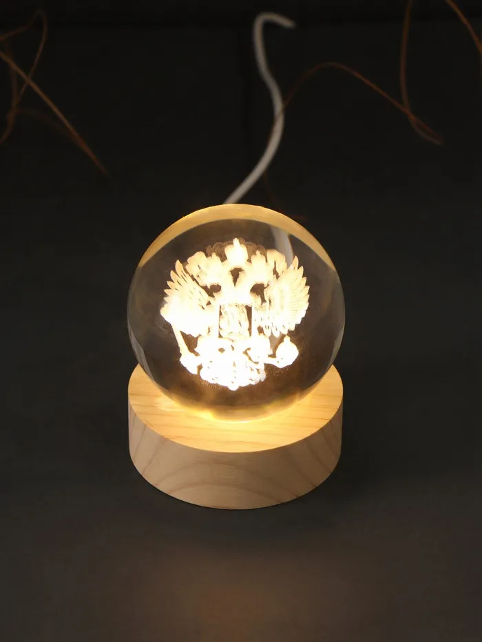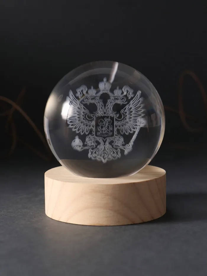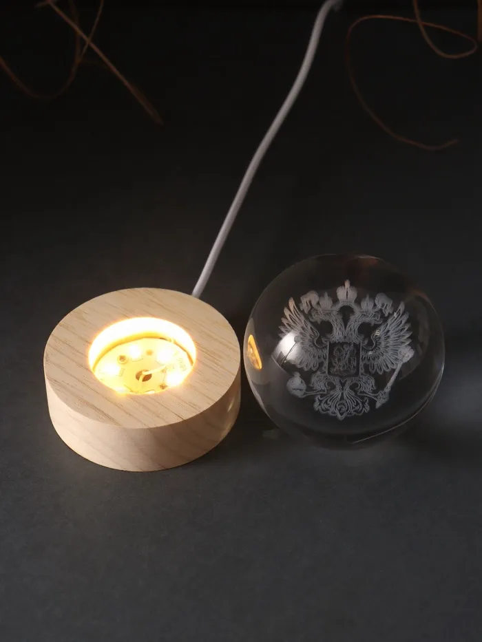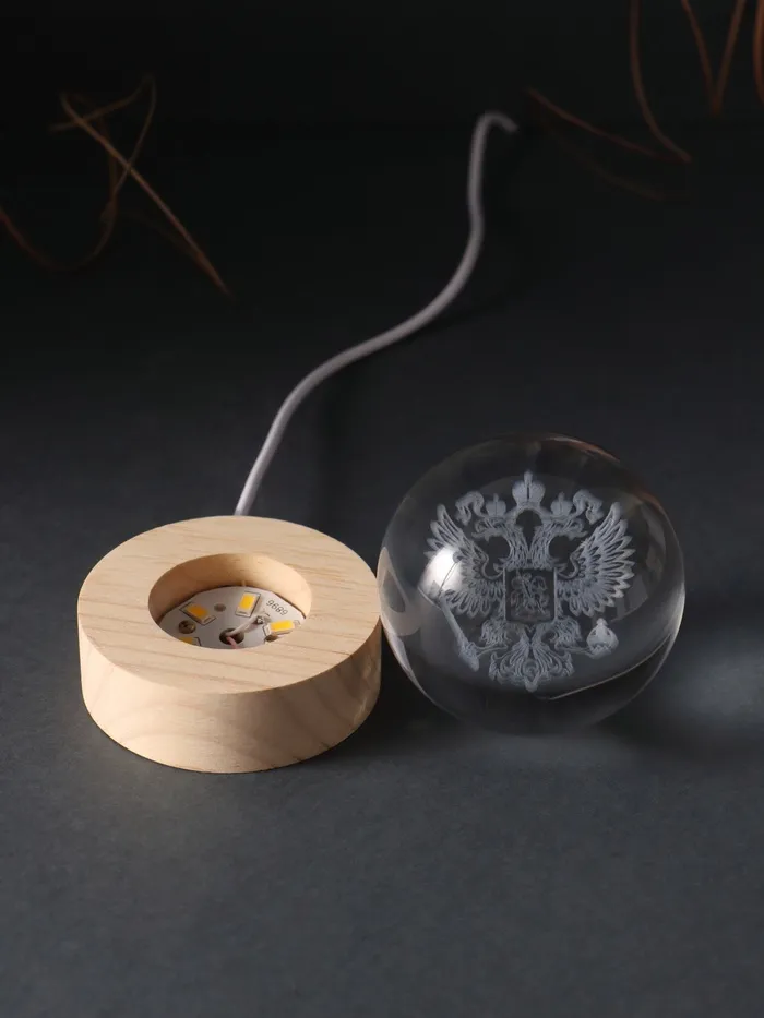 Световая фигурка стекло «Шар. Голограмма: Герб», d=6 см, подставка дерево, USB — Характеристики