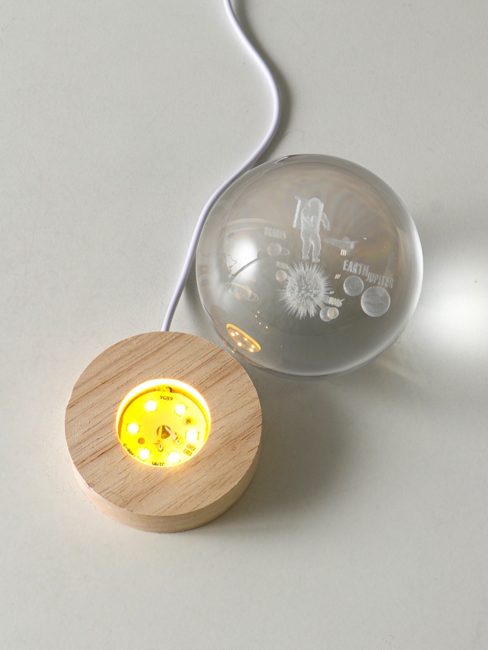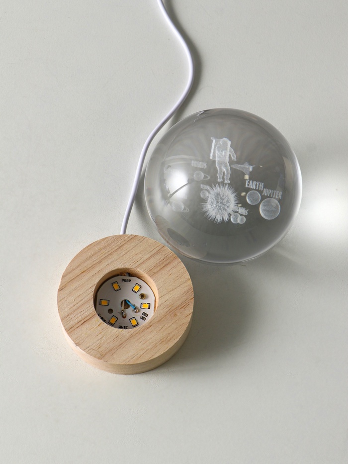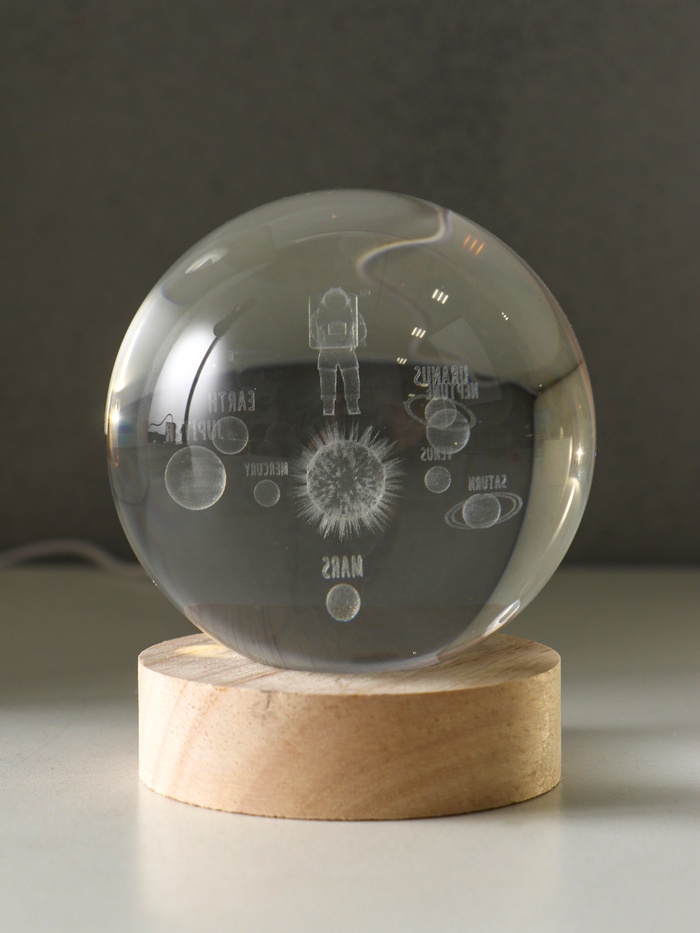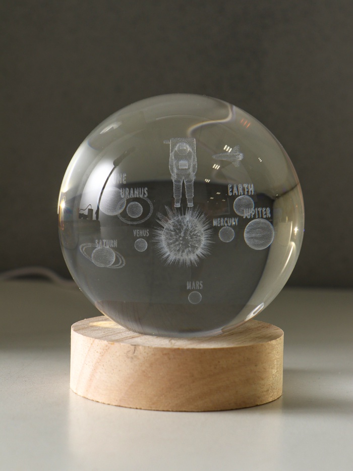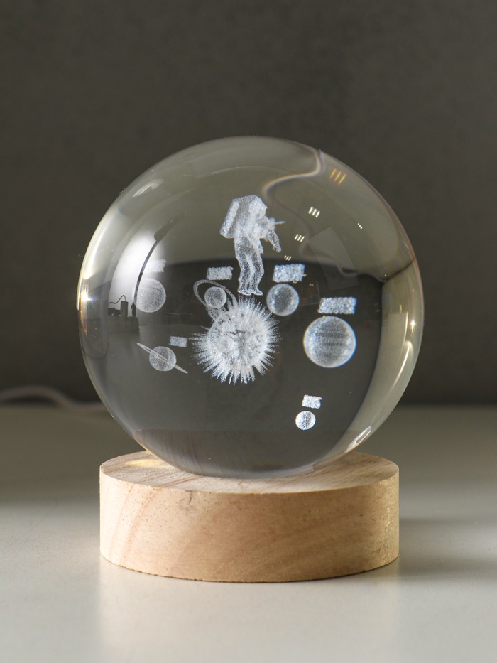 Световая фигурка стекло «Шар. Голограмма: Космонавт и планеты», d=8 см, подставка дерево, USB, 8×8×9.5 см