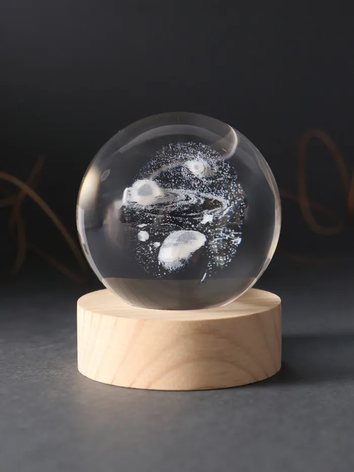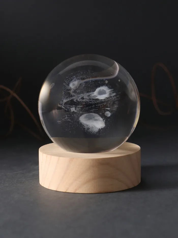 Представляем световой шар, который словно оживает в темноте, наполняя пространство тёплым сиянием и атмосферой загадочного космоса. Внутри прозрачного стеклянного шара диаметром 6 см заключена изящная голограмма — космическая композиция, которая будто переносит нас в бескрайние просторы Вселенной. Высотой всего 8 см, включая деревянную подставку, этот светильник станет идеальным акцентом для вашего рабочего стола, полки или даже комнаты ребёнка, мечтающего о звёздах.