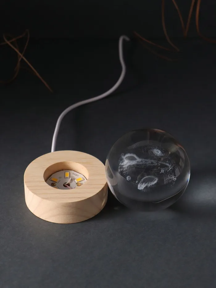 Изделие выполнено из высококачественных материалов: прозрачное стекло шара сочетается с натуральной текстурой деревянной подставки, создавая гармонию утончённости и природной красоты. Встроенные LED-элементы обеспечивают постоянное тёплое свечение, которое создаёт уютную атмосферу без лишнего блеска. Благодаря питанию от USB, светильник легко использовать в любом месте, где есть доступ к порту: дома, в офисе или даже в путешествии.