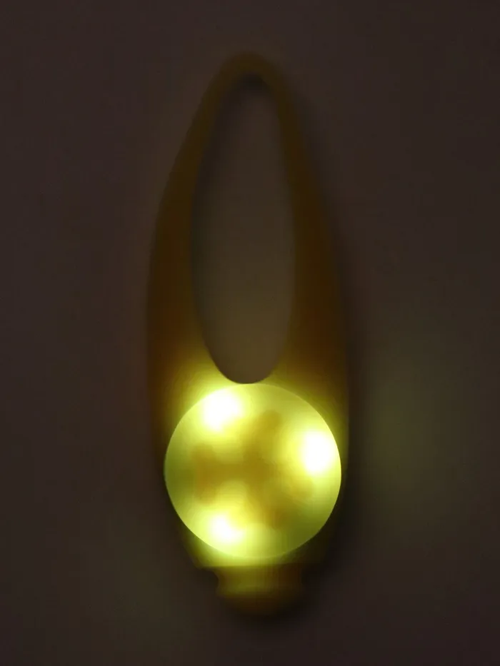 - Яркое свечение: Жёлтый цвет светодиода обеспечивает отличную видимость в темноте, позволяя другим участникам движения заметить вашего питомца издалека.