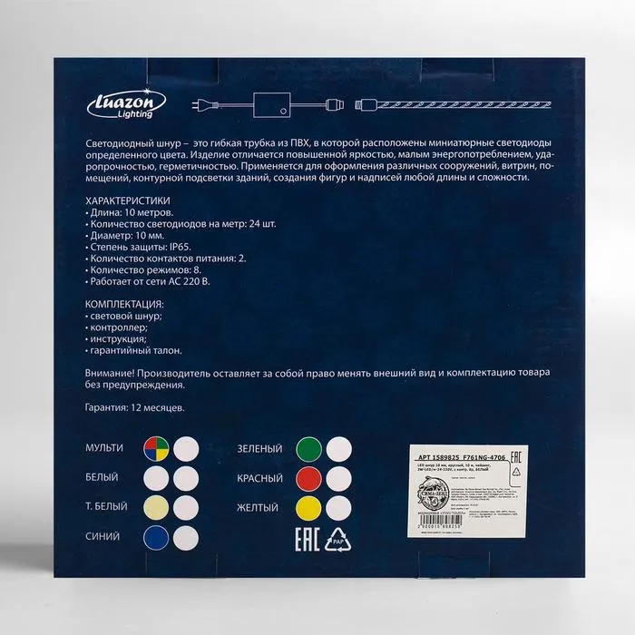 Световой шнур Luazon Lighting 10 мм, IP65, 10 м, 24 LED/м, 220 В, 8 режимов, свечение красное — Характеристики