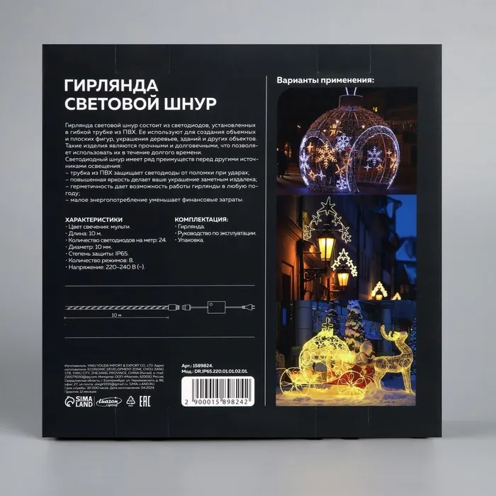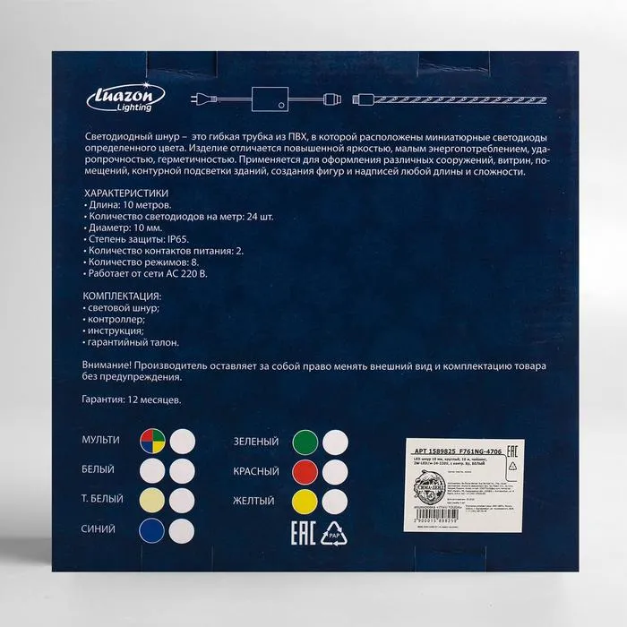 Световой шнур Luazon Lighting 10 мм, IP65, 10 м, 24 LED/м, 220 В, 8 режимов, свечение мульти — Характеристики