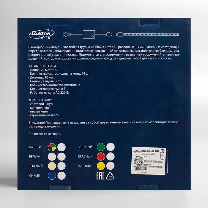 Световой шнур Luazon Lighting, 10 мм, IP65, 20 м, 24 LED/м, 220 В, 8 режимов, свечение зелёное — Характеристики
