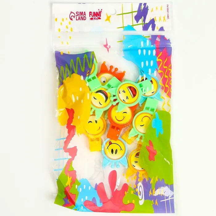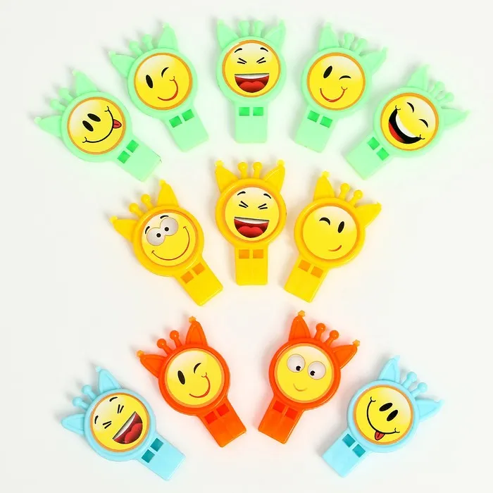 Свисток «Смайл» — это яркий и весёлый аксессуар для создания праздничного настроения. Устройство оснащено простым механизмом, который позволяет издавать громкий свист, что делает его идеальным дополнением для игр и детских праздников.