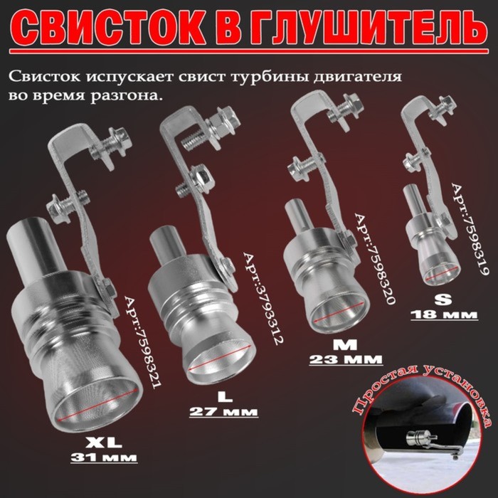 Свисток в глушитель, способный имитировать звук турбины. Монтируется в трубу глушителя, закрепляется на болт, это необходимо т.к. в глушителе создается давление способное вытолкнуть его при езде на больших оборотах. Принцип работы турбо свистка заключается в прохождении выхлопных газов под давлением через него, тем самым создавая свист-шипение точно как у турбированной машины.