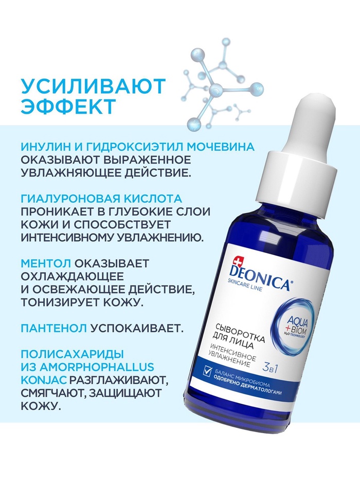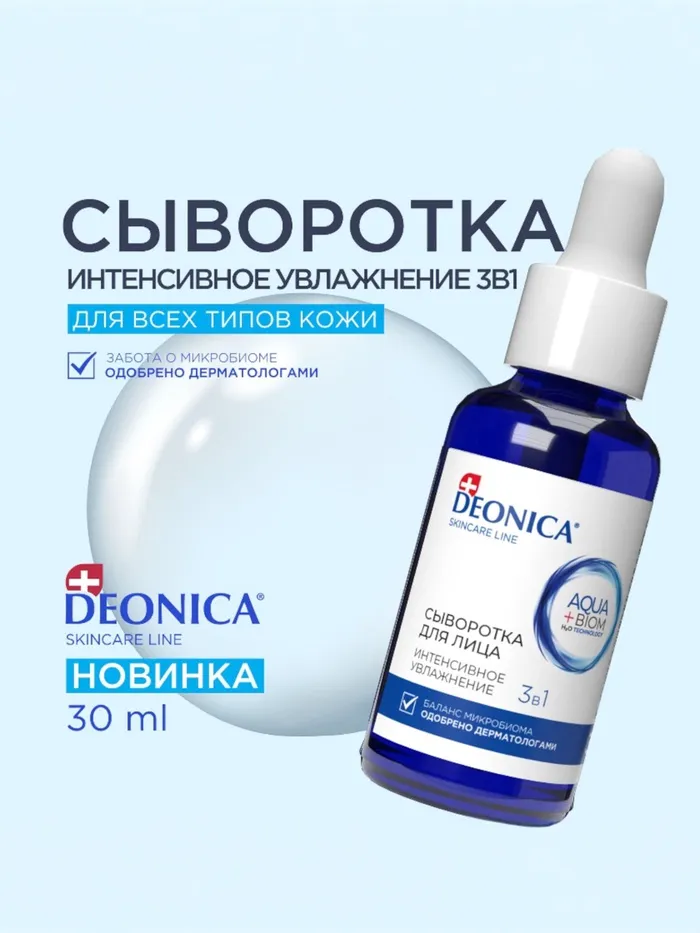 Сыворотка для лица интенсивное увлажнение 3 в 1 Deonica Skincare line — это инновационное средство, созданное для глубокого увлажнения и омоложения кожи. Она сочетает в себе три важнейших функции: интенсивное увлажнение, антивозрастной уход и улучшение текстуры. Увлажняющая сыворотка подходит для всех типов кожи, обеспечивая ей глубокое питание и увлажнение благодаря содержанию двух видов гиалуроновой кислоты: низкомолекулярная проникает в глубокие слои, способствуя интенсивному увлажнению, а среднемолекулярная обеспечивает баланс влаги и поддерживает защитный барьер. Гиалуроновая сыворотка для лица помогает удерживать влагу в коже делая её мягкой и эластичной, что позволяет использовать ее в качестве основы под макияж.