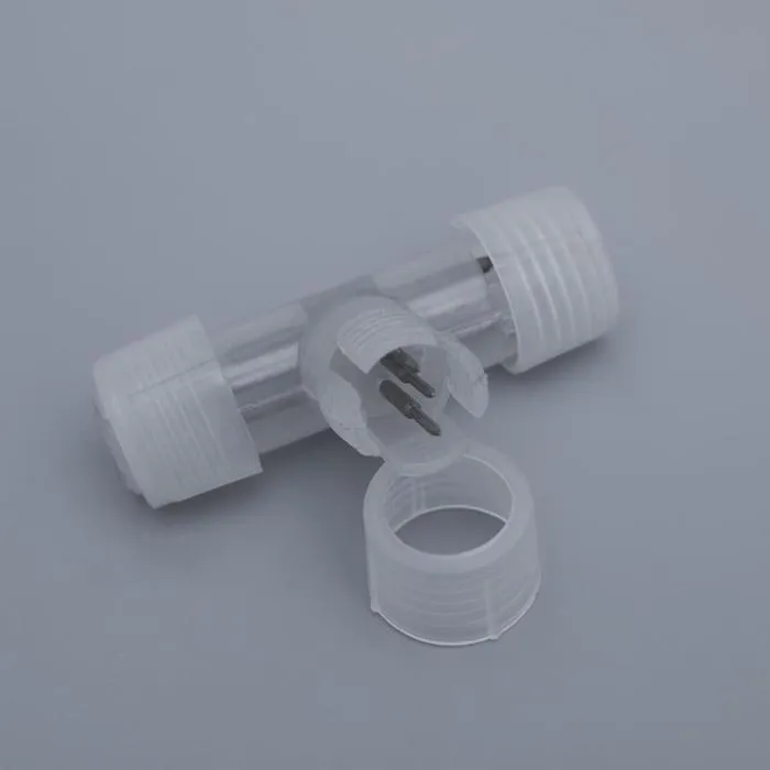 Коннектор Т-образный для дюралайта, 13 мм, 3W служит для соединения светодиодного дюралайта или гибкого неона при необходимости удлинения шнура, а также для организации места стыка в углах или создания примыканий и перекрестий.