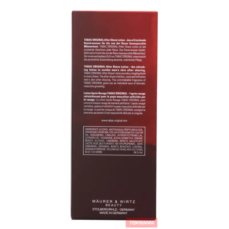 Этот продукт подходит для всех типов кожи и предотвращает появление раздражения и воспалений. Его утонченный аромат дарит бодрость и уверенность в течение всего дня. Лосьон после бритья Tabac Original — это выбор настоящих мужчин, которые ценят качество и комфорт.