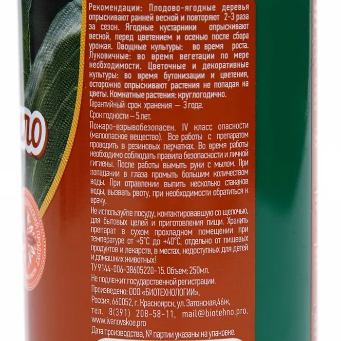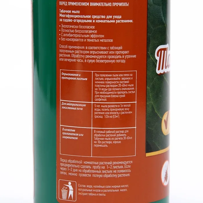 Природное средство для защиты комнатных и садовых растений от болезней и вредителей. Экстракт табака усиливает губительный для насекомых эффект препарата являясь при этом безопасным для человека. Пихтовый экстракт, входящий в состав мыла, активизирует иммунитет, повышает устойчивость растений к болезням и, тем самым повышая урожайность.