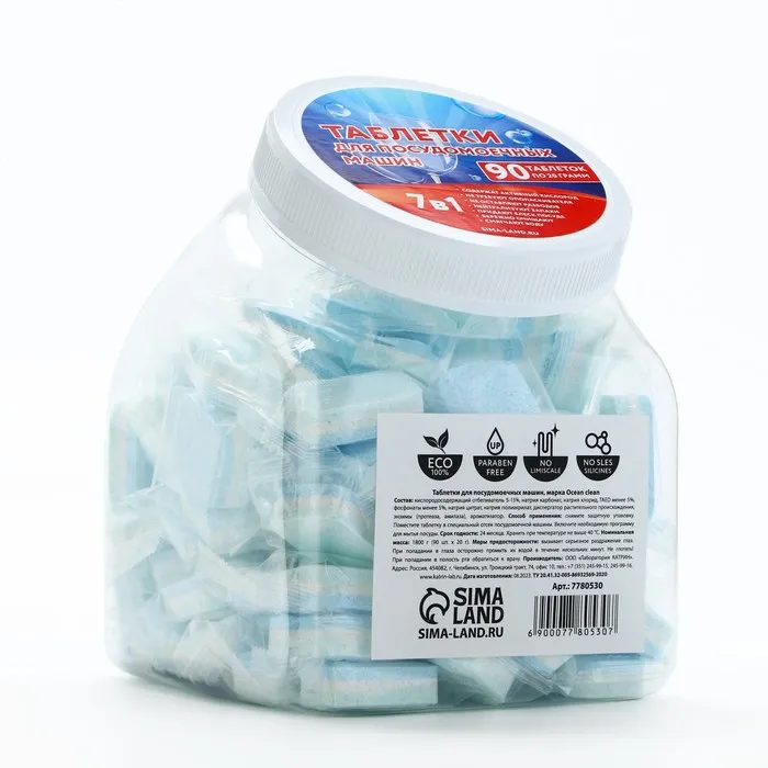 Кислородосодержащий отбеливатель 5-15%, натрия карбонат, натрия хлорид, ТАЕД менее 5%, фосфонаты менее 5%, натрия цитрат, натрия полиакрилат, диспергатор растительного происхождения, энзимы (протеаза, амилаза), ароматизатор.ПРИМЕНЕНИЕ: снимите защитную упаковку. Поместите таблетку в специальный отсек посудомоечной машины. Включите необходимую программу для мытья посуды.
