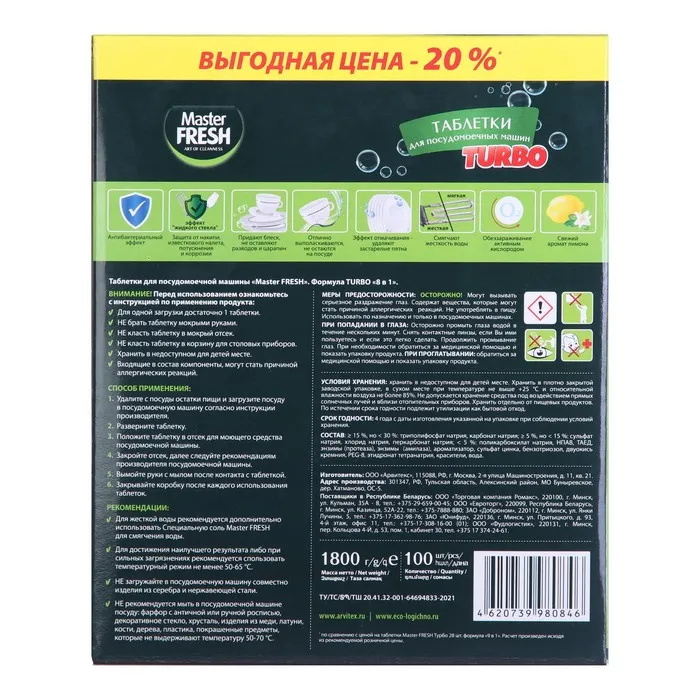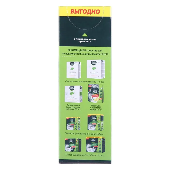 Высокоэффективный состав таблеток для посудомоечных машин Master FFRESH TURBO справляется с самыми сильными и сложными загрязнениями. Легко устраняет любые пятна, в том числе от чая, кофе и губной помады. Ухаживает за изделиями из стекла, нержавеющей стали и серебра, не царапает посуду. Обладает эффектом отмачивания. Придает посуде блеск. Защищает посудомоечную машину от накипи и коррозии. Антибактериальный эффект.