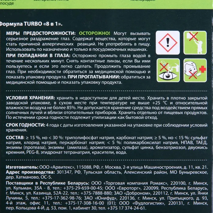 Состав: триполифосфат натрия ≥ 15%, < 30%, карбонат натрия ≥ 15%, < 30%, сульфат натрия ≥ 5%, < 15%, хлорид натрия ≥ 5%, < 15%, перкарбонат натрия ≥ 5%, < 15%, поликарбоксилат натрия < 5%, неионогенные ПАВ < 5% , ТАЕД < 5% , энзимы: протеаза < 5% и амилаза < 5%, ароматизатор < 5% , сульфат цинка < 5%, бензотриозол < 5% , двуокись кремния < 5%, PEG-8 < 5%, этидронат тетранатрия < 5%, красители < 5%, вода < 5%.