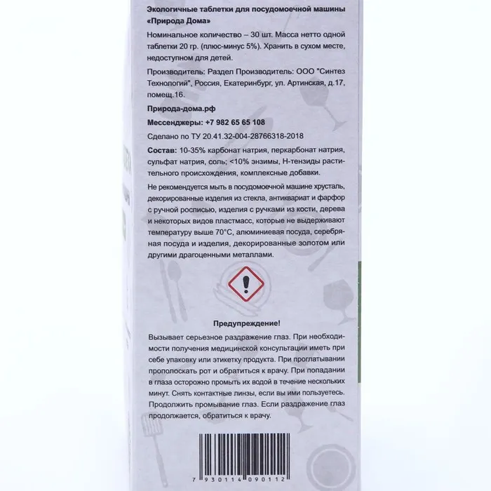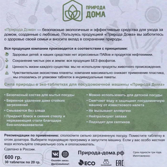 Эко таблетки для посудомоечной машины «Природа Дома» великолепно отмывают посуду до блеска, не оставляя разводов и налета. Полностью смываются с посуды, без запаха. Не содержать фосфаты, синтетические ПАВ. Подходят для мытья детской посуды, гипоаллергенные. Защищают посудомоечную машину от накипи, могут использоваться в домах с септиками.
