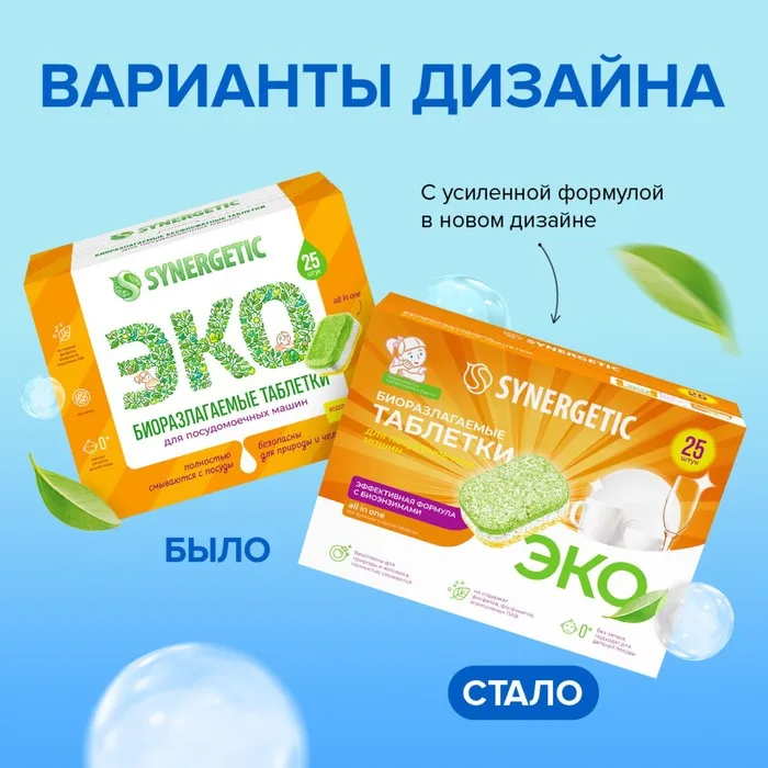 Биоразлагаемые бесфосфатные таблетки для посудомоечных машин SYNERGETIC в водорастворимой пленке - это экологичное, безопасное и эффективное средство.