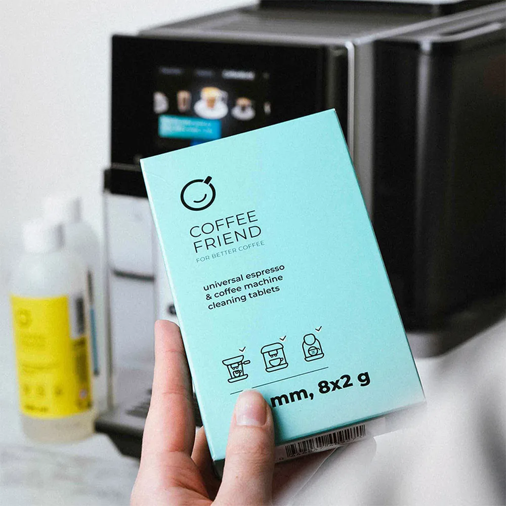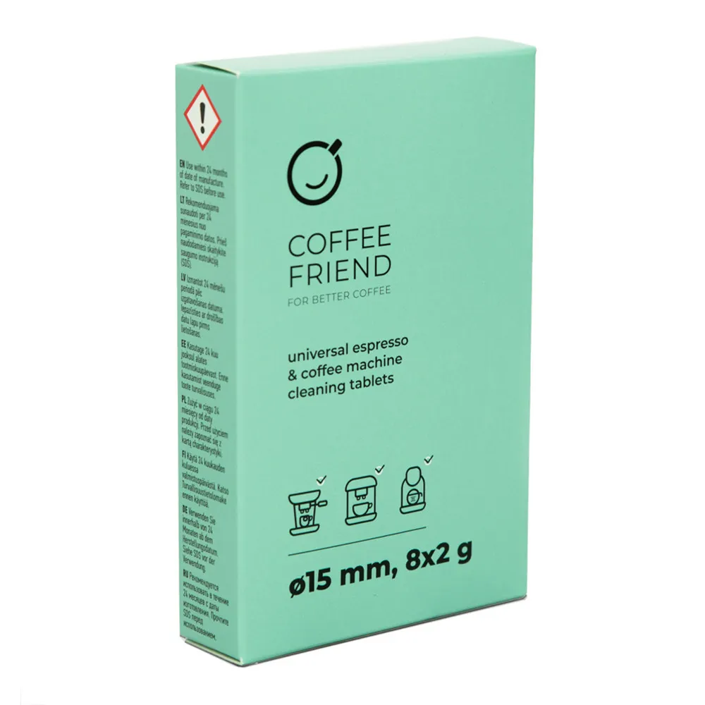 Универсальные чистящие таблетки «Coffee Friend» для эспрессо- и кофемашин предназначены для эффективного удаления остатков кофе и масел. Подходят для всех типов кофемашин. В упаковке 8 таблеток, что хватит на 8 чисток.