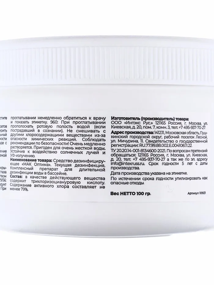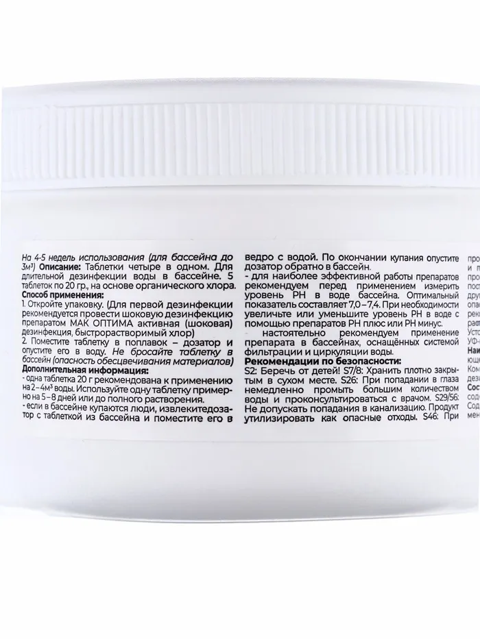 Описание: многофункциональный комплексный препарат, и он является отличным вариантом для обработки воды плавательного бассейна. Он дезинфицирует воду на высоком уровне, медленно растворяется из-за этого, тщательно убирает и разрушает все бактерии разного вида и наросты водорослей, имеет свойство очищать цвет воды и убирает ее мутность.