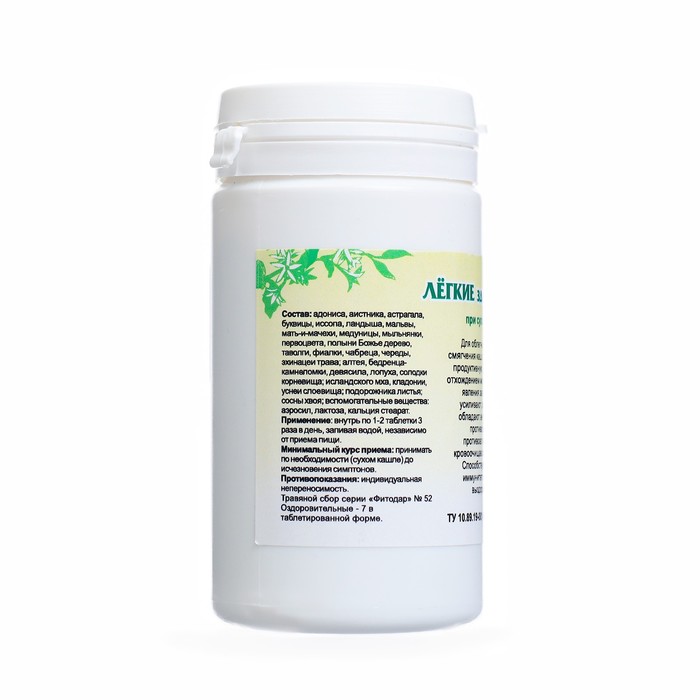 адониса, аистника, астрагала, буквицы, иссопа, ландыша, мальвы, мать-и-мачехи, медуницы, мыльнянки, первоцвета, полыни Божье дерево, таволги, фиалки, чабреца, череды, эхинацеи трава; алтея, бедренца-камнеломки, девясила, лопуха, солодки корневища; исландского мха, кладонии, уснеи слоевища; подорожника листья; сосны хвоя; вспомогательные вещества: аэросил, лактоза, кальция стеарат.