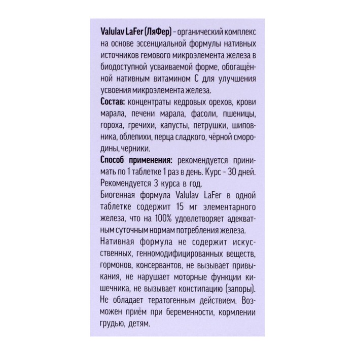 Биогенная формула Valulav LaFer в одной таблетке содержит 15 мг элементарного железа, что на 100% удовлетворяет адекватным суточным нормам потребления железа.