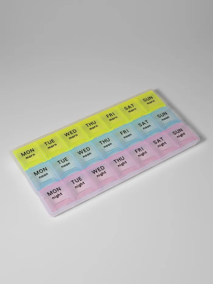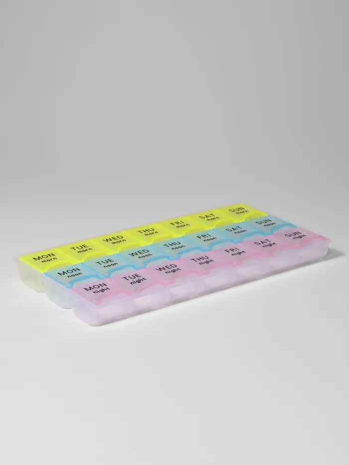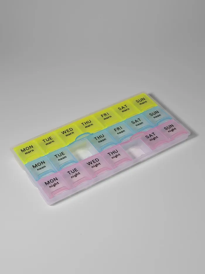 Конструкция из трёх рядов позволит разложить препараты в зависимости от времени суток: распределите таблетки и витамины на утренний, дневной и вечерний прием на две недели вперед и сохраняйте привычный ритм жизни.