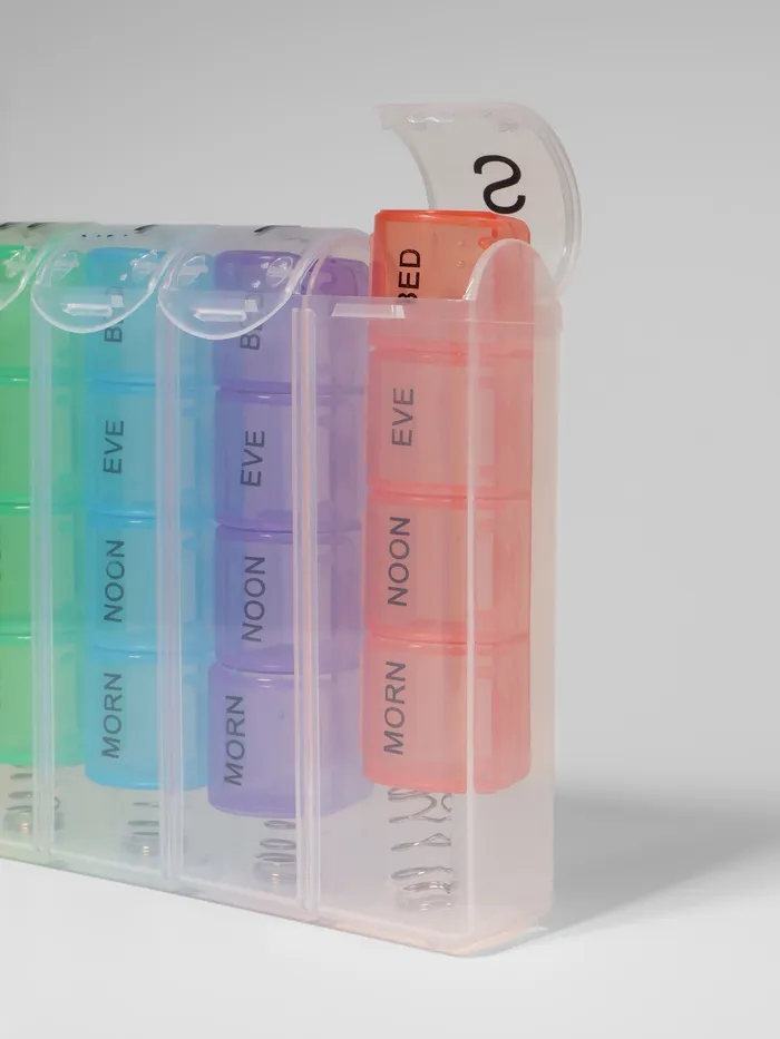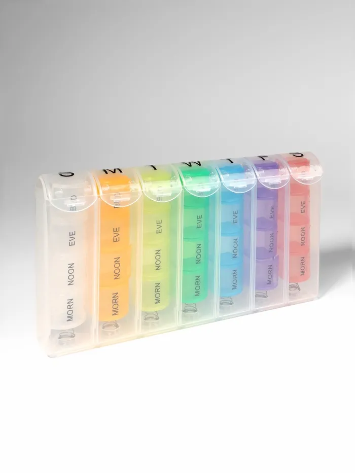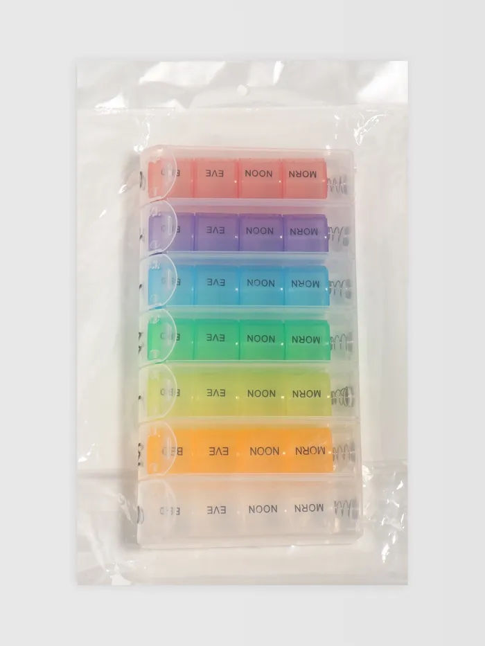 Таблетница - органайзер «Неделька», английские буквы, утро/день/вечер/ночь, 10 × 20 × 3 см, 7 контейнеров по 4 секции, разноцветная — Характеристики
