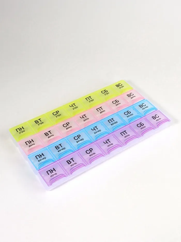 Конструкция из четырёх рядов позволит разложить препараты в зависимости от времени суток: распределите таблетки и витамины на утренний и вечерний прием на неделю вперед и сохраняйте привычный ритм жизни.