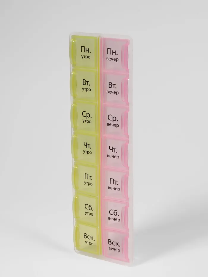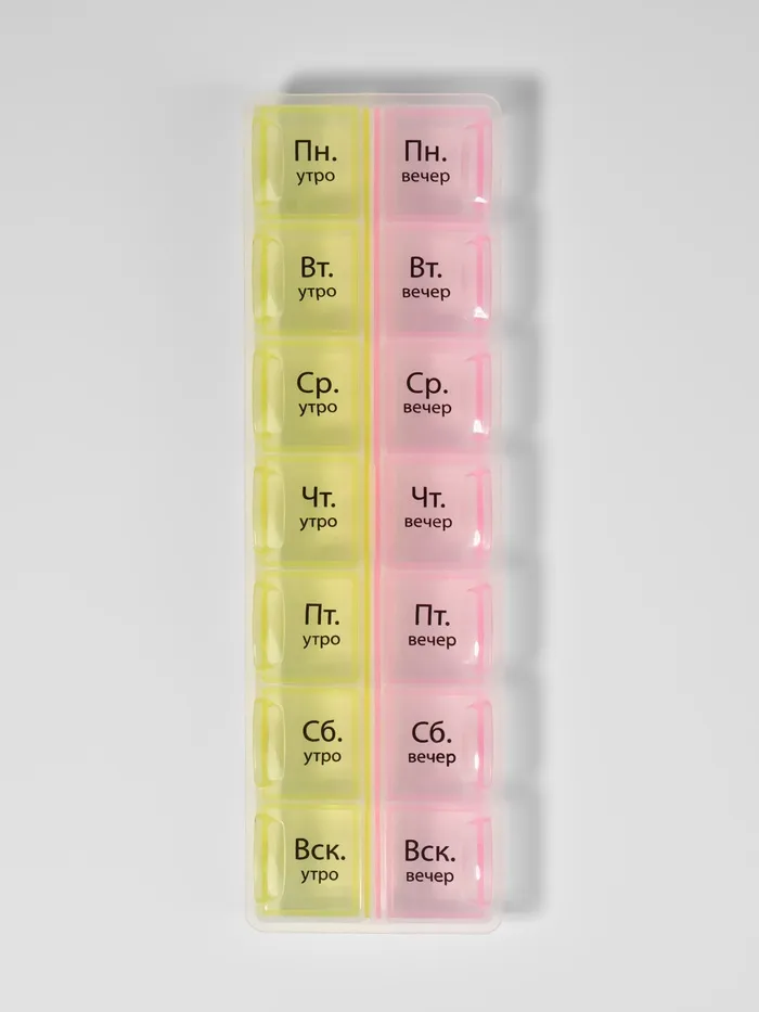 Таблетница - органайзер «Неделька», русские буквы, утро/вечер, 21,5 × 6,5 × 2 см, 14 секций, цвет жёлтый/розовый — Характеристики