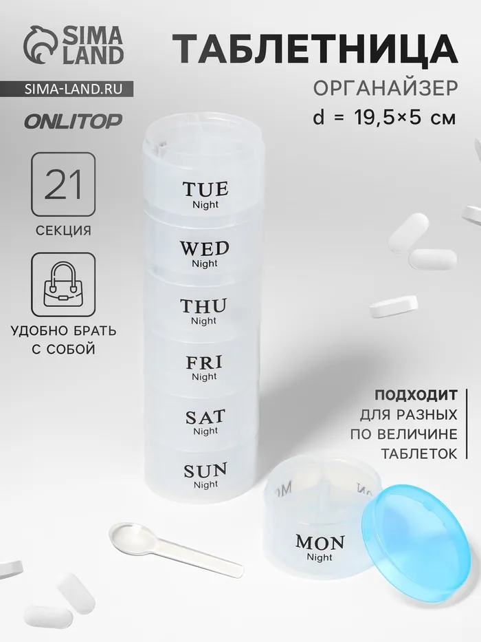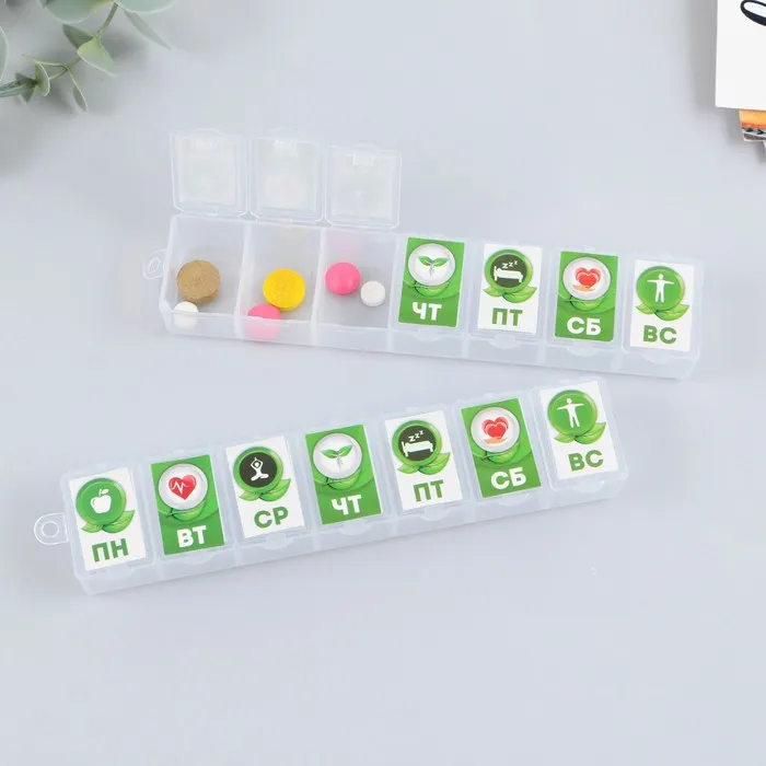 Воспользуйтесь таблетницей-органайзером, чтобы не забыть в течение дня принять лекарственные препараты и укрепить иммунитет. Изделие сохранит необходимые лекарства, чтобы в важный момент вам не пришлось лихорадочно искать пилюлю в сумке или чемодане. Рассортируйте содержимое аптечки на каждый день недели и отправляйтесь в путь. Контейнер подходит для хранения различных мелочей не только в путешествии, но и дома.