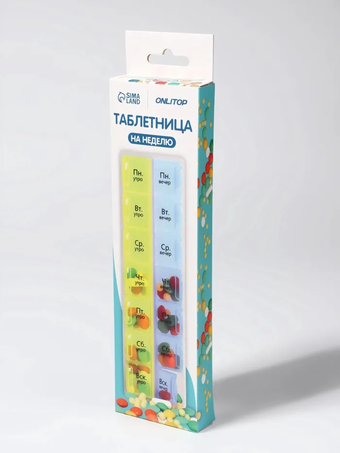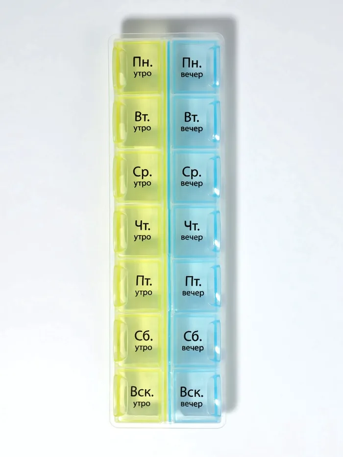 Таблетница - органайзер «Неделька», русские буквы, утро/вечер, 21.5×6.5×2 см, 14 секций, жёлтая, голубая — Характеристики