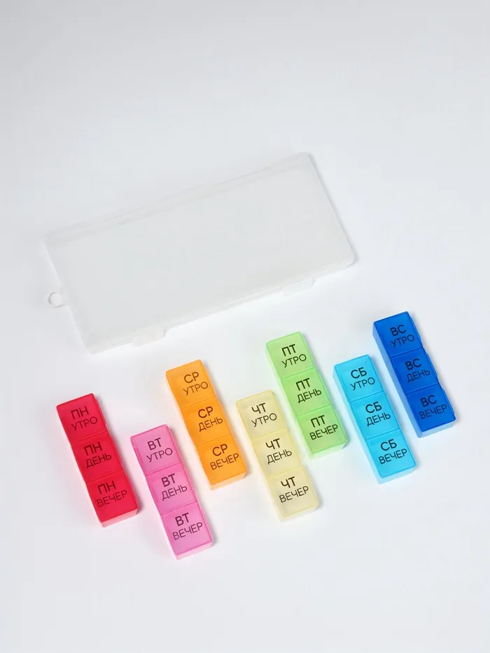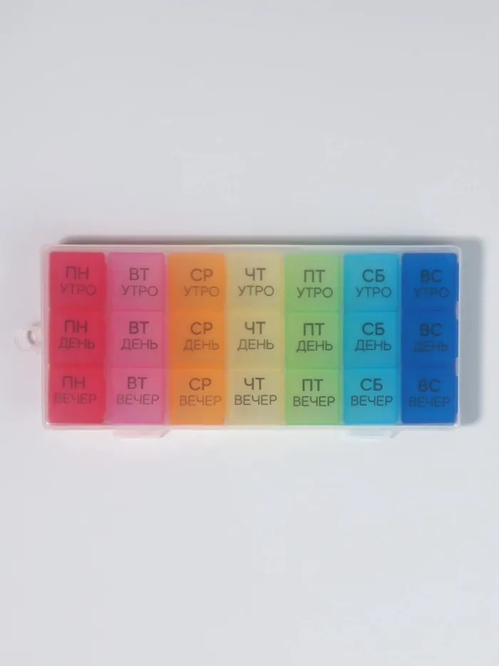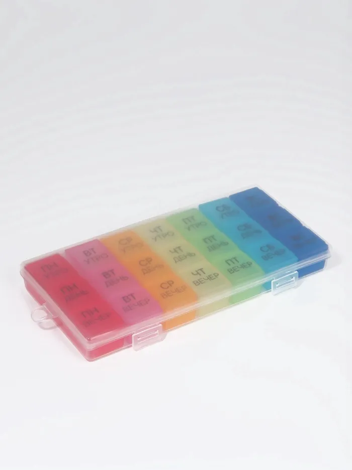 Теперь Вы не забудете принять витамины или таблетки в течение дня: удобная и функциональная таблетница поможет распределить приём нужных препаратов по дням недели и вовремя вспомнить о них.