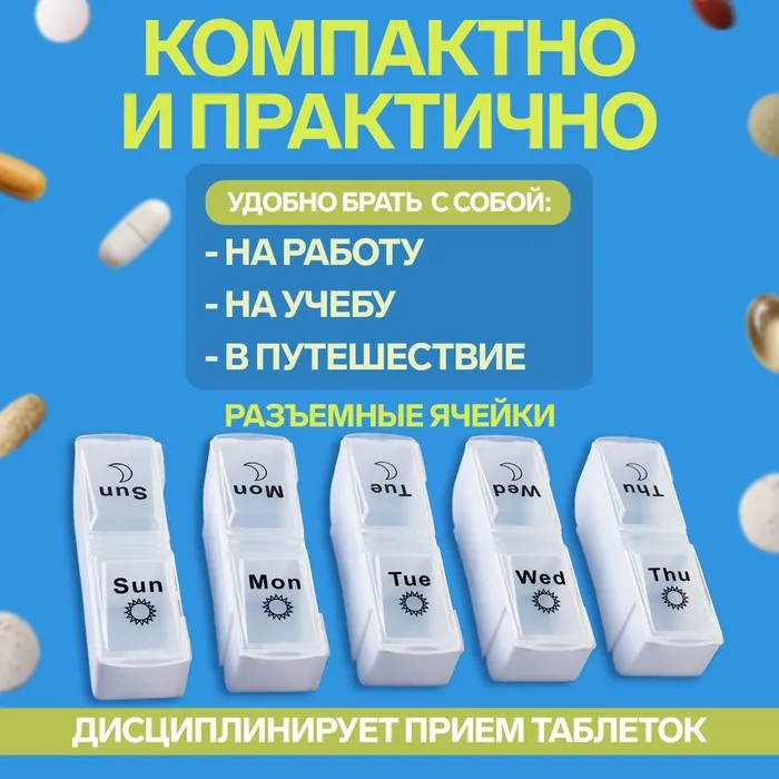 Защитит Ваши таблетки от грязи в сумке и не заставит в спешке искать их по чемодану или сумке. Разные отсеки позволяют разделить приём лекарств и нормализировать своё здоровье.