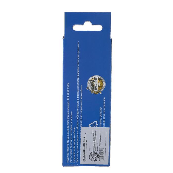 Парковочная табличка с номером телефона имеет подвижную конструкцию. Набор имеет трафарет с цифрами от 0 до 9- это позволяет быстрого и легкого составить или изменить номера телефона, в случае если автомобилем пользуется не один водитель. В нижней части корпуса находится клейкая лента, которая позволяет надежно прикрепить табличку в нужном месте автомобиля. Современный дизайн таблички не будет выделяться из интерьера салона вашего автомобиля. Парковочная табличка залог спокойствия водителя.