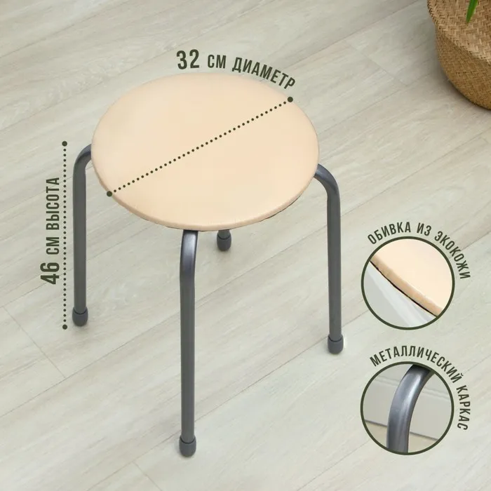 Табурет изготовлен из облегчённой мебельной трубы. Мягкое обтянутое искусственной кожей сиденье диаметром 32 сантиметра порадует всех любителей комфорта. Специальная конструкция ножек позволяет компактно сложить мебель «друг на друга», существенно сэкономив пространство.