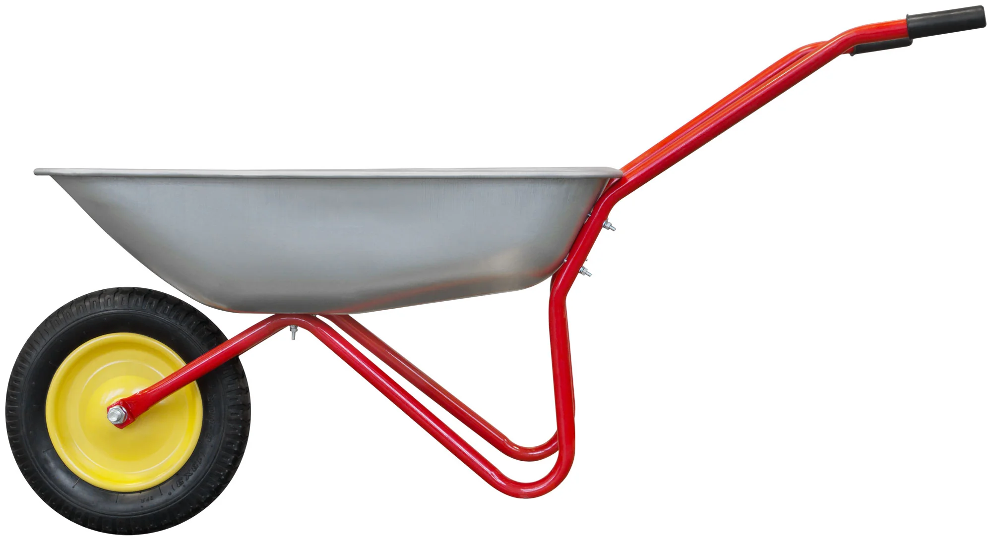Тачка оснащена прочной рамой из стальной крашеной трубы с диаметром 28 х 1,2 мм. Оцинкованный стальной кузов обеспечивает защиту от коррозии и увеличивает срок службы изделия. Пневматическое колесо диаметром 350 мм с камерой и посадочным диаметром 16 мм обеспечивает легкость движений даже на неровной поверхности.