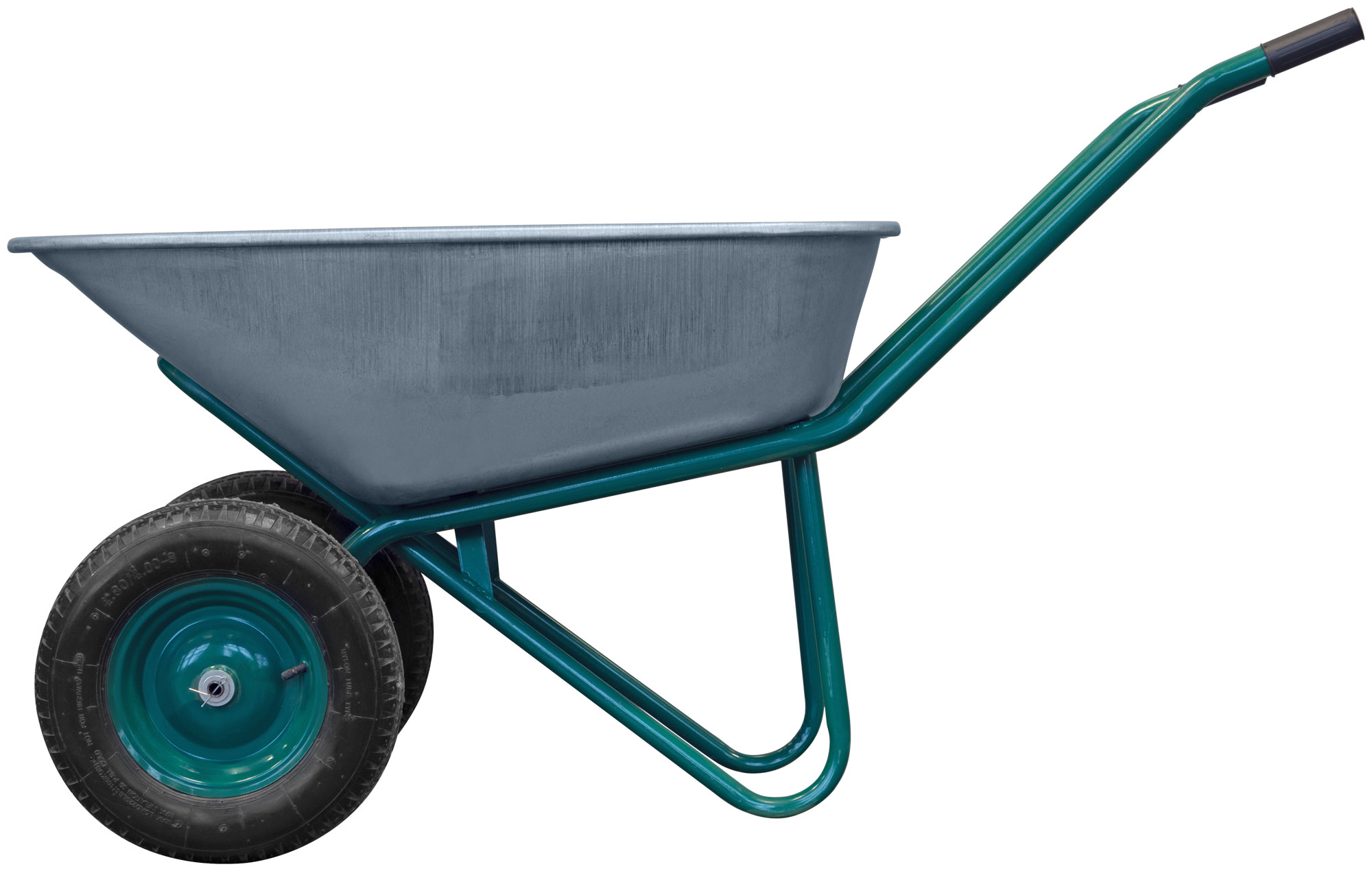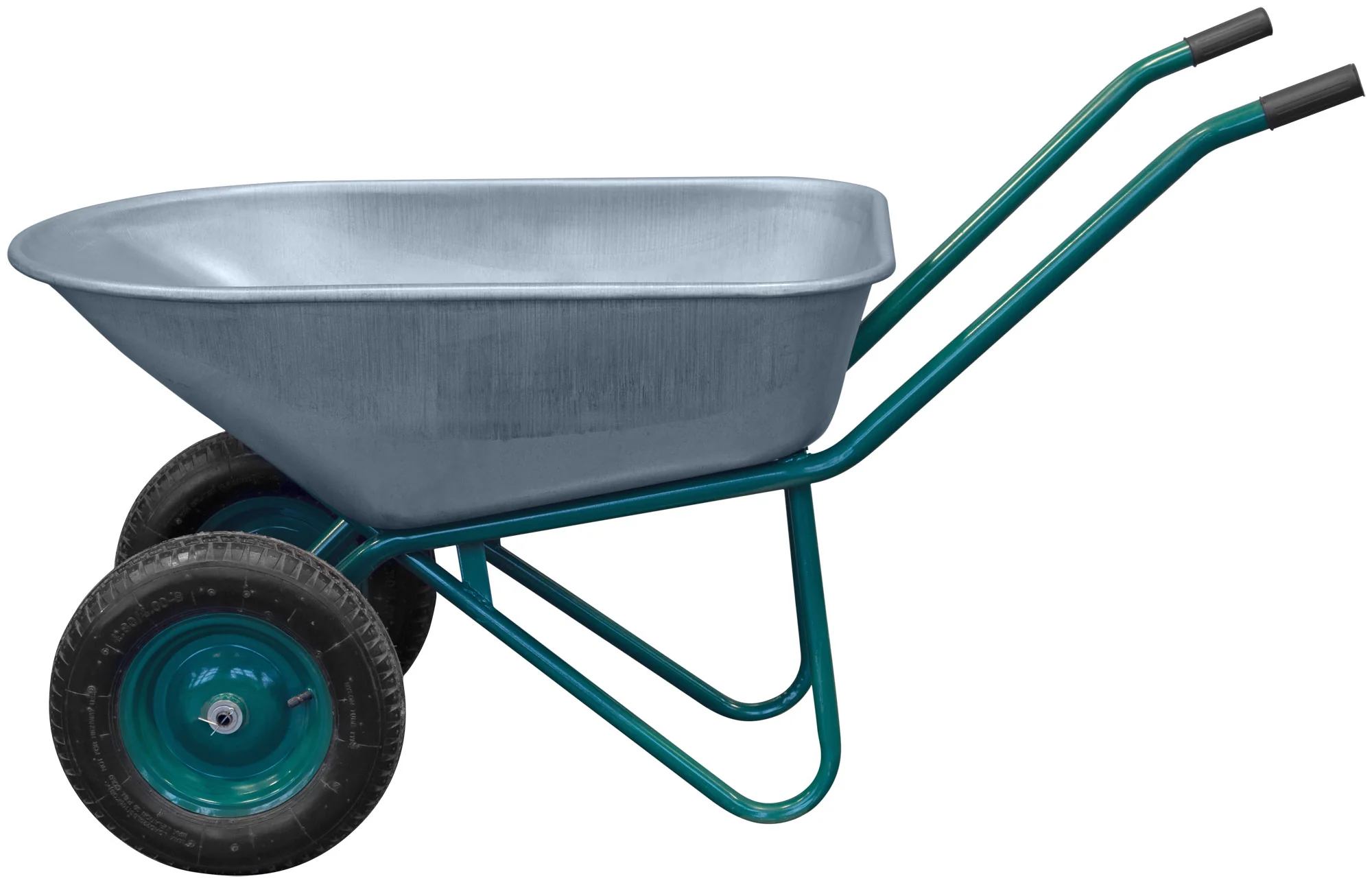 Тачка оснащена прочной стальной оцинкованной рамой и кузовом, что обеспечивает долговечность и устойчивость к коррозии. Надувные колеса диаметром 400 х 90 мм делают передвижение по неровной поверхности легким и плавным.