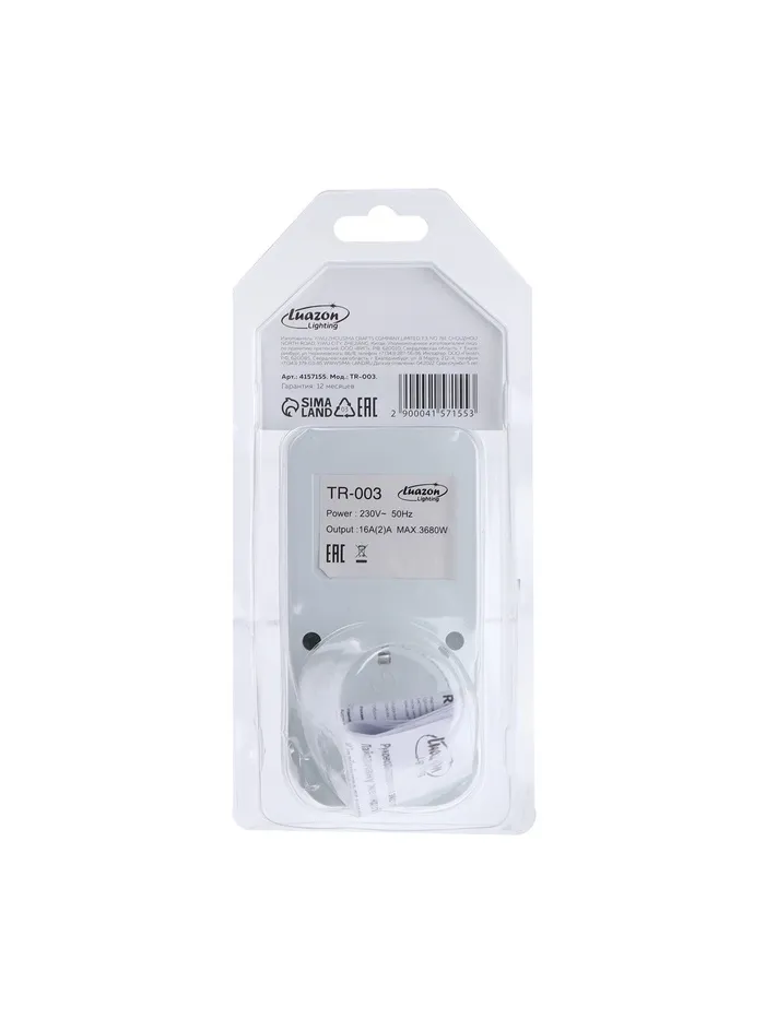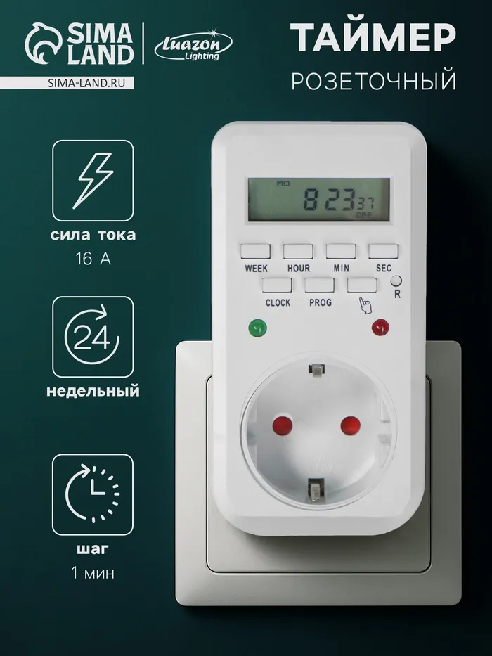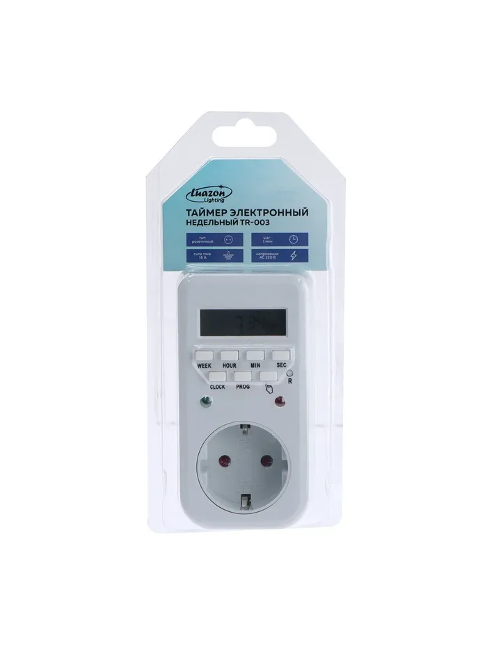 Розеточный электронный таймер Luazon Lighting недельный, 16A, шаг 1 мин, 220 В можно использовать в системе «Умный дом». Модель оптимальна для контролирования включения устройств через определенные промежутки времени. Устройство имеет специальную вилку для подсоединения к сети электропитания посредством стандартной розетки. Для комфортного управления настройками на таймере есть кнопки и условные обозначения. Специальный разъем можно применять для подключения совместимых устройств. Модель с прочным пластиковым корпусом из износостойкого пластика не подвержена преждевременному износу, механическим повреждениям, трещинам и сколам. Поверхность можно протирать сухой салфеткой из мягкой ткани.