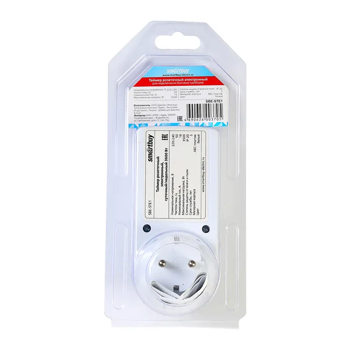 Умная розетка Smartbuy SBE-STE1 рассчитана на максимальную нагрузку в 3.6 кВт и ток в 16 А. Напряжение в сети не может превышать 230 В. Исходя из невысокой степени пылевлагозащиты (IP20) умная розетка должна устанавливаться только в сухих и отапливаемых помещениях. Благодаря таймеру в такую розетку удобно включать электрочайники, чтобы к вашему приходу был готов кипяток для заваривания чая или кофе. Выполненная из белого пластика, умная розетка вполне подходит под большинство интерьеров, как домашних, так и офисных.