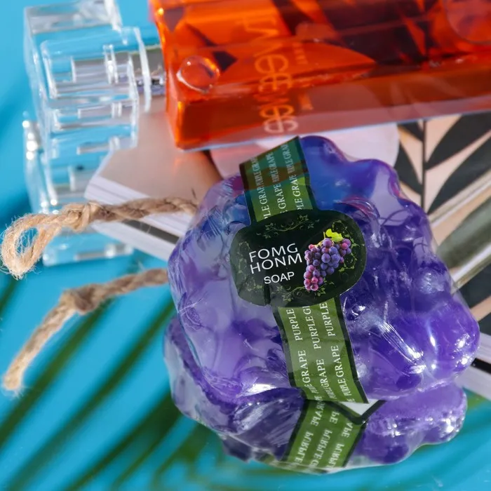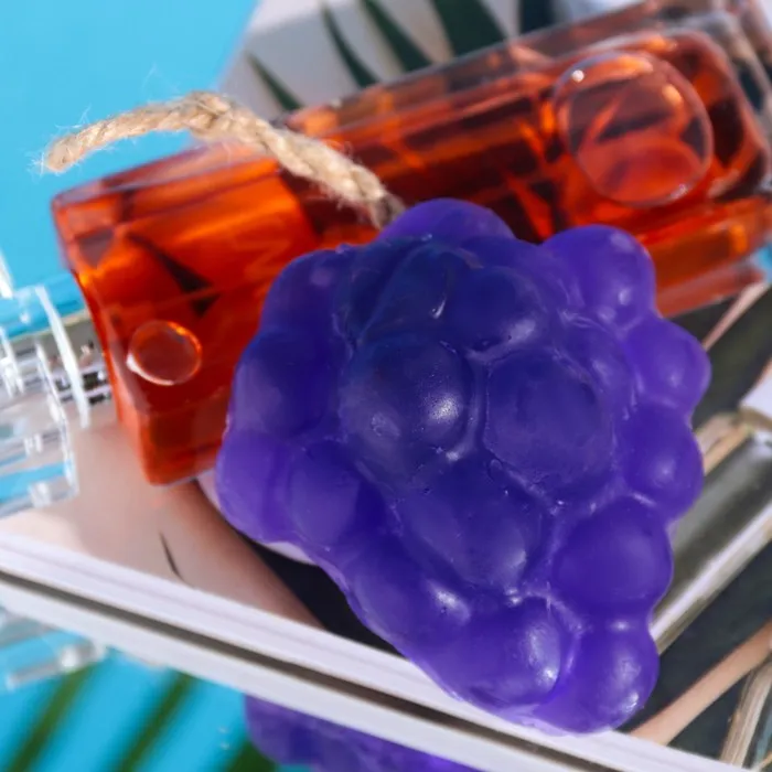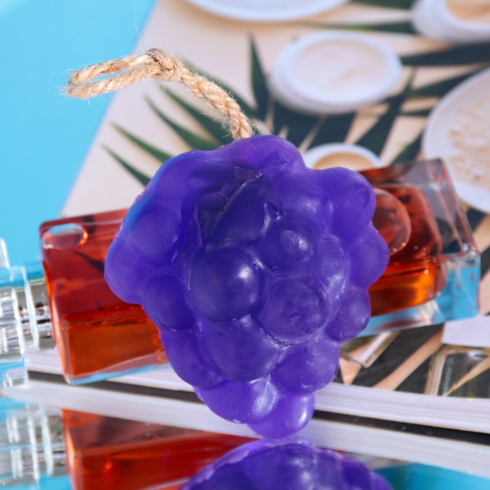 Мыло оформлено в виде виноградной грозди, предусмотрена веревочка, имитирующая ветвь и позволяющая с удобством расположить изделие. Оно порадует запоминающимся и соблазнительным сладковато-терпким ароматом. Тайское фруктовое мыло Виноград изготавливается вручную и включает полезные для кожи экстракты цветов и фруктов. Продукция с приятным ароматом винограда придаст бодрости и подойдет для любых банных процедур или в качестве подарка.