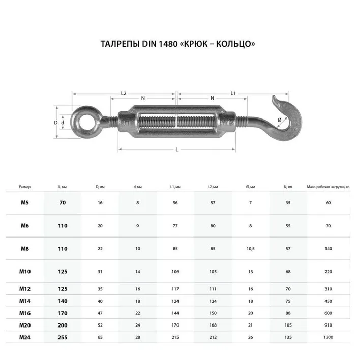 - Конфигурация «крюк-кольцо»: Крюк дает возможность быстрого зацепа без дополнительных приспособлений, а кольцо обеспечивает стационарное крепление на болт или шпильку. Это расширяет сферу применения талрепа в различных монтажных схемах.