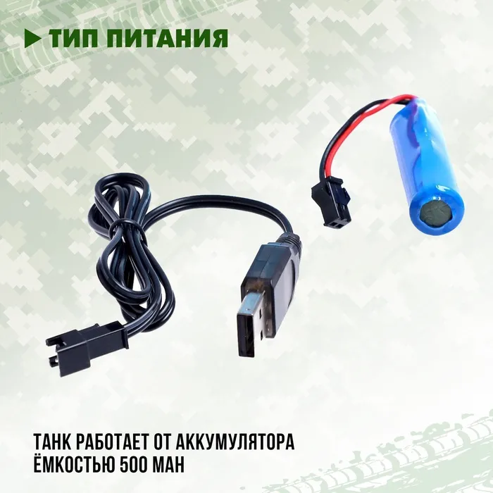 - Работает от аккумулятора: танк оснащён аккумулятором ёмкостью 500 мАч, что обеспечивает долгие часы увлекательных игр.