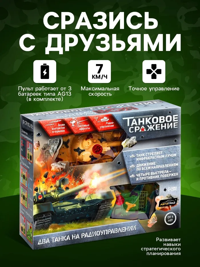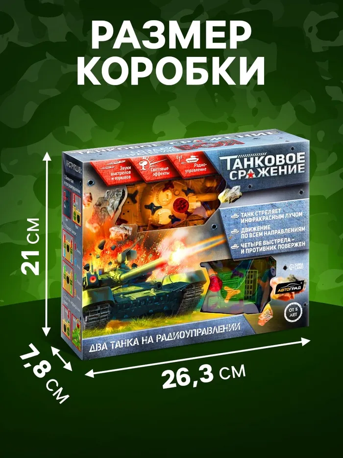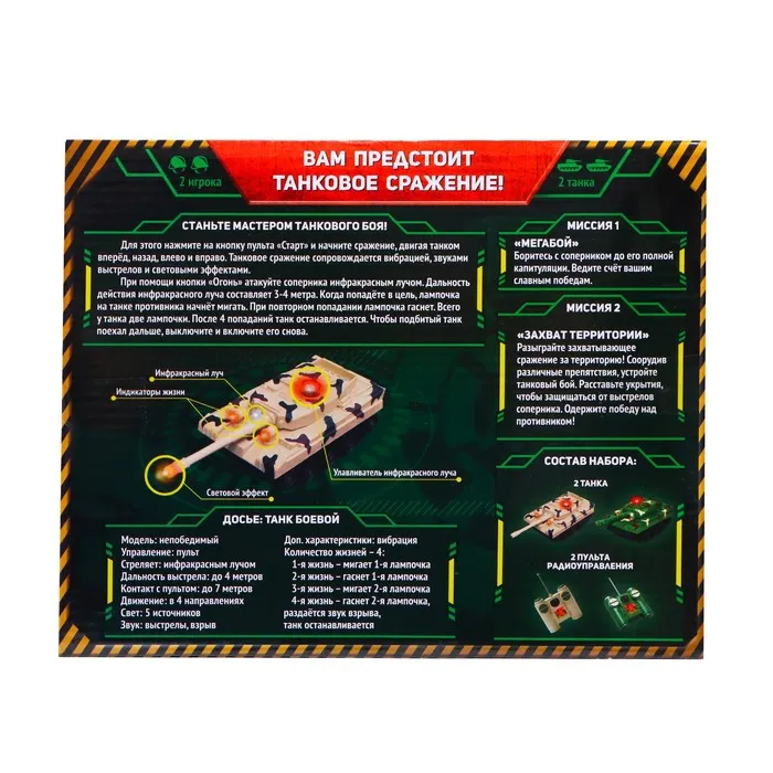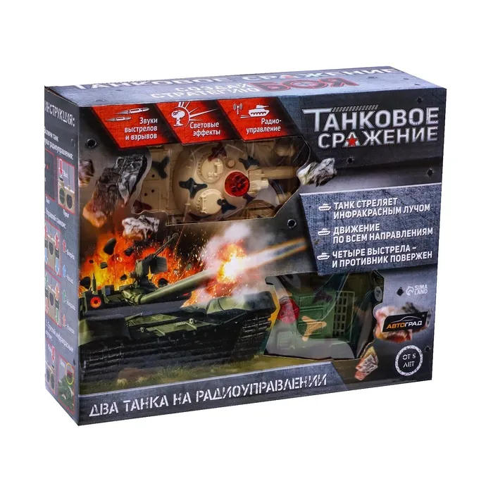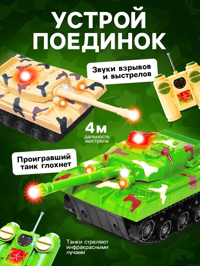 Танковый бой — это набор из двух радиоуправляемых танков, которые могут бороться друг с другом. Каждый танк имеет уникальную раскраску, световые и звуковые эффекты, чтобы сделать игру более захватывающей.