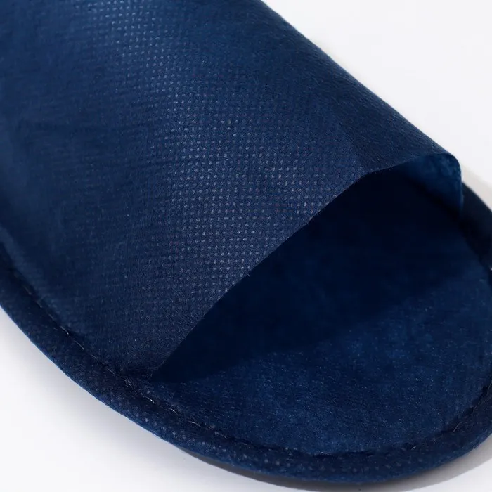 Одноразовые тапочки темно-синие с открытым мысом на нескользящей подошве имеют ровные швы и прошиты плотной ниткой. Союзка (верхний мыс) так же прошит с двух сторон, что значительно повышает прочность тапочка и обеспечивает длительное ношение без повреждений. Одноразовую обувь очень удобно взять с собой в дорогу или предложить гостям.