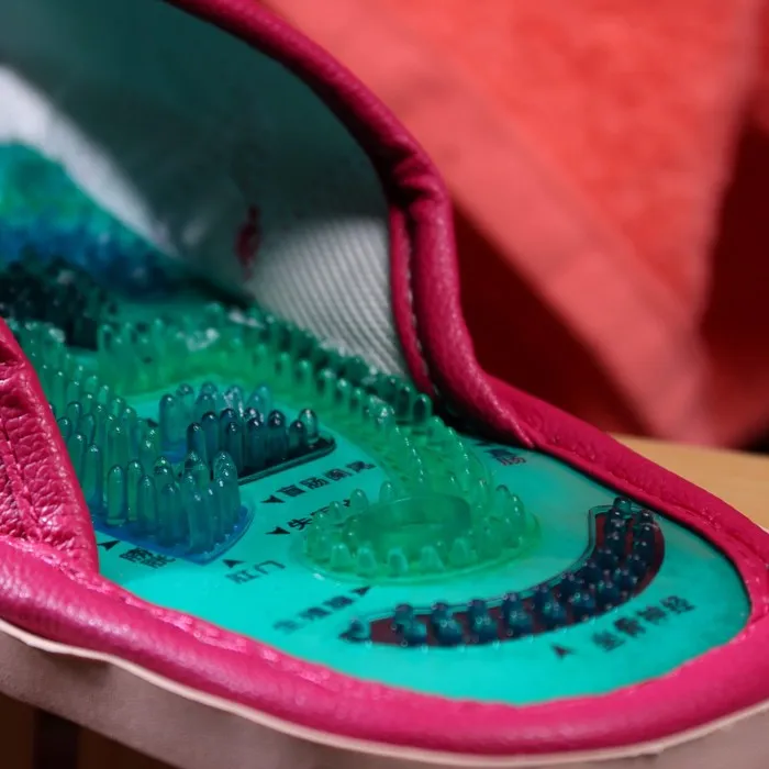 Массажные тапочки (массажные шлепанцы) с магнитами и турмалином - терапевтическое средство, обеспечивающее релаксирующий массаж стоп в домашних условиях. Идеальное решение для тех, кто страдает варикозным расширением вен, плоскостопием, нарушением кровообращения, костными шпорами и другими заболеваниями нижних конечностей. Стельки тапочек (массажные тапочки здоровье) обладают уникальной конструкцией, стимулирующей биологически - активные точки, расположенные на ногах. Применение массажных тапочек оказывает общее профилактическое и оздоравливающее действие на организм, способствует укреплению иммунитета, эффективному выведению шлаков, снятию болей и мышечной усталости, качественному улучшению сна и повышению тонуса. Износостойкая противоскользящая подошва. Тапочки массажные на ногу с высоким подъемом, на широкую ногу. Длина подошвы тапочек 25 см. Показания к применению рефлекторных массажных тапочек: бессонница, упадок сил, стресс, хронические отеки ног.