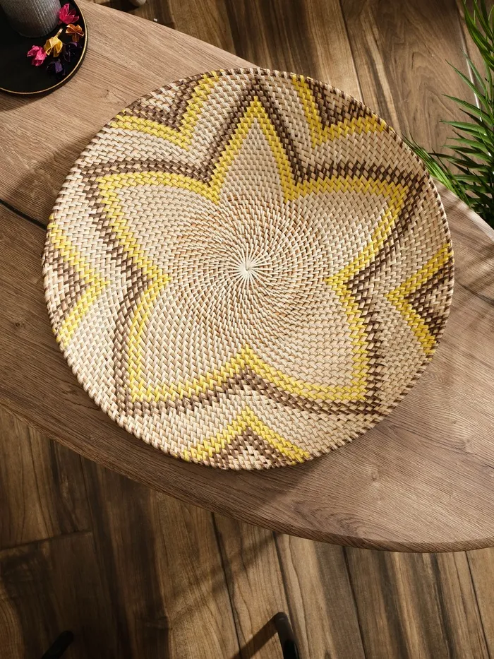 Плетёная декоративная тарелка в форме цветка — это стильный акцент для вашего интерьера, который сочетает в себе природную эстетику и современный дизайн. Её чёрно-жёлтая цветовая гамма добавляет яркости и контраста, а натуральный ротанг в сочетании с пластиком делает изделие лёгким, прочным и долговечным. Идеальный выбор для тех, кто ценит гармонию природы и функциональность.