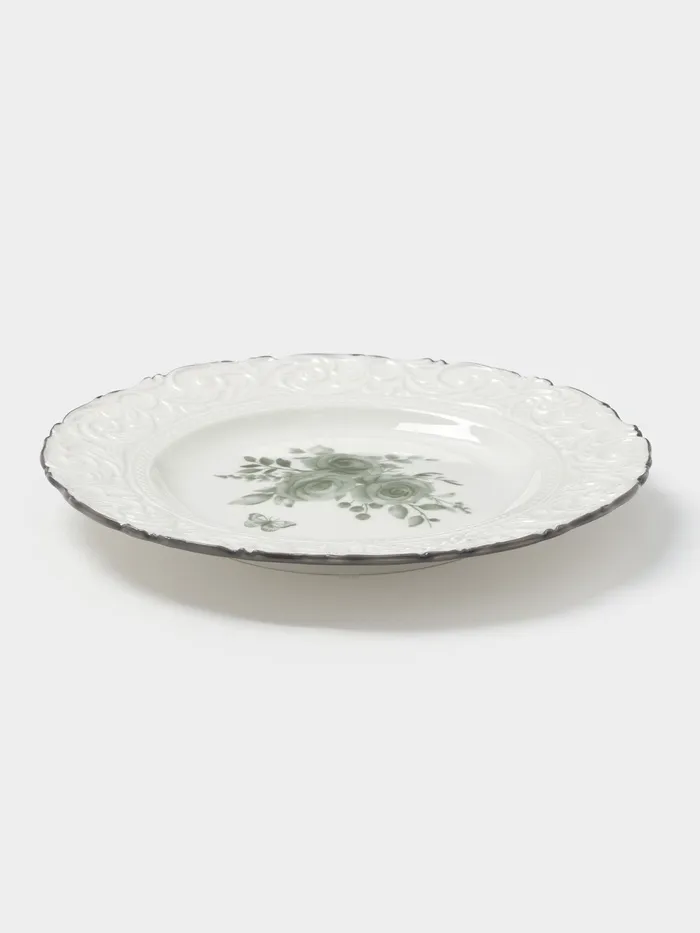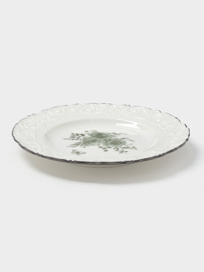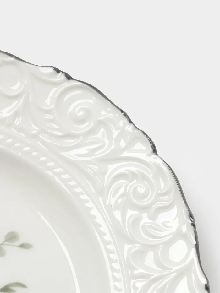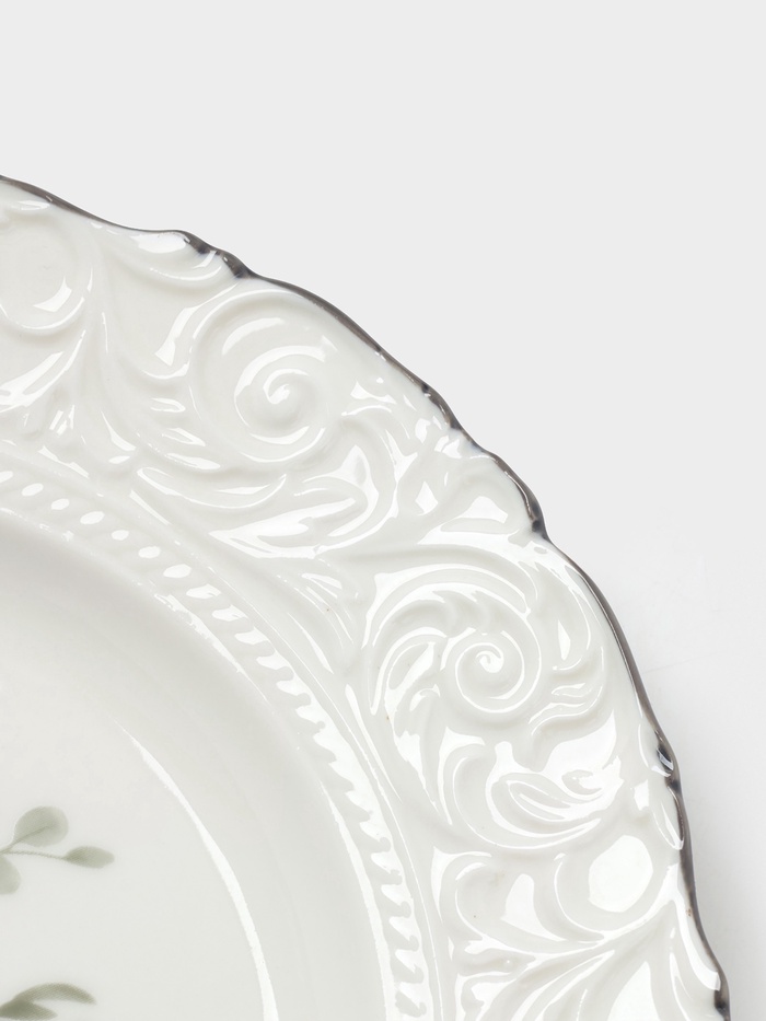 Эта тарелка станет стильным дополнением любой сервировки, подчеркивая красоту десертов и фруктов. Ее цветочно-растительный орнамент и рельефный дизайн создают уютную атмосферу за столом. Использование качественного фарфора гарантирует долговечность и сохранение внешнего вида даже при частом использовании. Идеальный выбор для тех, кто ценит гармонию в деталях и хочет подчеркнуть особенность каждого блюда.