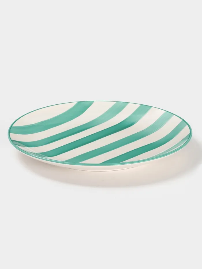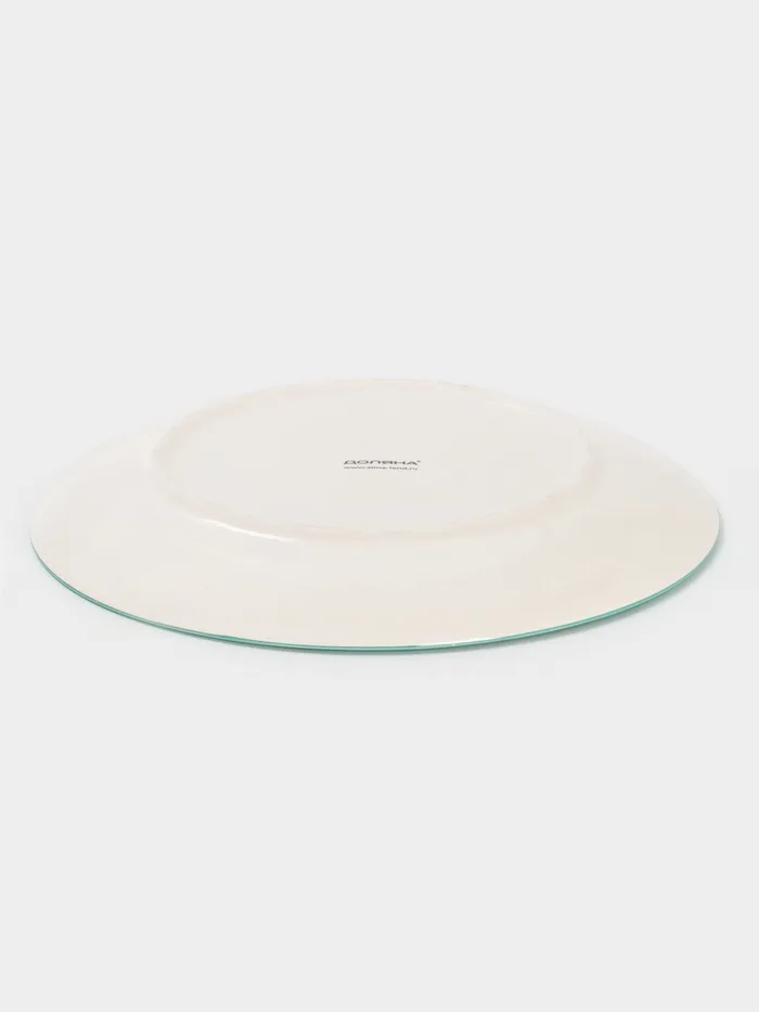 Эта плоская керамическая тарелка с бирюзовыми полосками - практичное и стильное дополнение к вашему столу. Ее диаметр 26,5 см идеально подходит для сервировки основных блюд.
